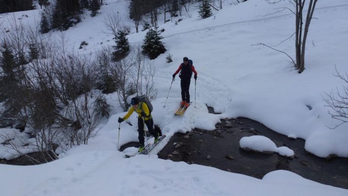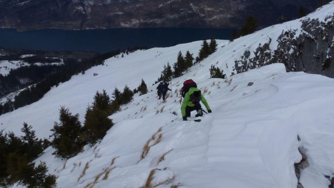 Die Wind- und Wetterverhältnisse wechselten stets in der vorherrschenden Föhnlage. Mal schien die Sonne, mal war es recht diffus. Auf den Gipfeln zog es unangenehm kalt. Niederschlag - auch in Form von Schnee - gab es keinen, was eigentlich schon nötig wäre. Aber inzwischen gibt man sich mit dem, was da ist, glücklich! Auf den Abfahrten musste man schon sehr achten, die Steinberührungen so gering wie möglich zu halten. Trotzdem gab es schöne Passagen im Aufstieg, wie auch bei den Abfahrten. Der Mürtschenstock bildet eine beeindruckend wilde und schöne Bergkulisse. Ebenfalls gibt der Tiefenblick auf den Walensee einem den Eindruck norwegischer Fjordlandschaft.