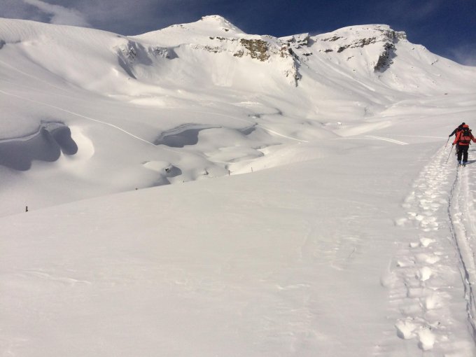 Überwiegend Pulver, Flanke vor Leiter und Gipfelhang windgepresst und tlw. abgeblasen. Leider hatte sich die Sicht bei der Abfahrt verschlechtert und wir folgten den Abfahrtsspuren über die Beverinlücke. Genügend Schnee und mit Pulverauflage schöne Abfahrt bis Wergenstein.