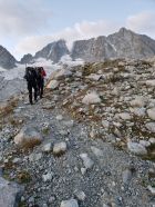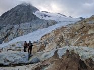 Wir sind zwei Tage davor mit dem (kostenlosen!) Shuttlebus vom (kostenpflichtigen) Parkplatz Ponte Verde bis zum Endpunkt des Val Genova (Malga Bedole) gefahren und von dort auf die Rifugio Mandrone (Traumlage, aber demotiviertes Team, neuer sehr schön gestalteter Aufenthaltsraum mit Panoromafenster, dafür Schlafräume mit teilweise Schimmelbefall) aufgestiegen. Am nächsten Tag folgte dann die sehr schöne Wanderung mit Überquerung des Passo Cercen zur Rifugio Denza. Dies diente dann gleichzeitig der Inspektion des Gletschers und der Wahl des oben erwähnten besten Einstiegs. Die Rifugio Denza ist dann auch sehr sympathisch von Erika und Mirco, der auch gerne in Deutsch Auskunft über die Tour gibt, geführt. Dass wir in der Gegend nicht auf Massen stoßen werden, haben wir ja erwartet. Dass wir aber dann von der Mandrone bis zur Denza und am nächsten Tag bei Traumwetter und ebensolchen Verhältnissen bis zum Gipfel aber gar niemanden angetroffen haben, hat uns dann doch überrascht. Dabei hat sich die Überschreitung des höchsten Trentiners aus unserer Sicht doch das Prädikat „empfehlenswert“ mehr als verdient.