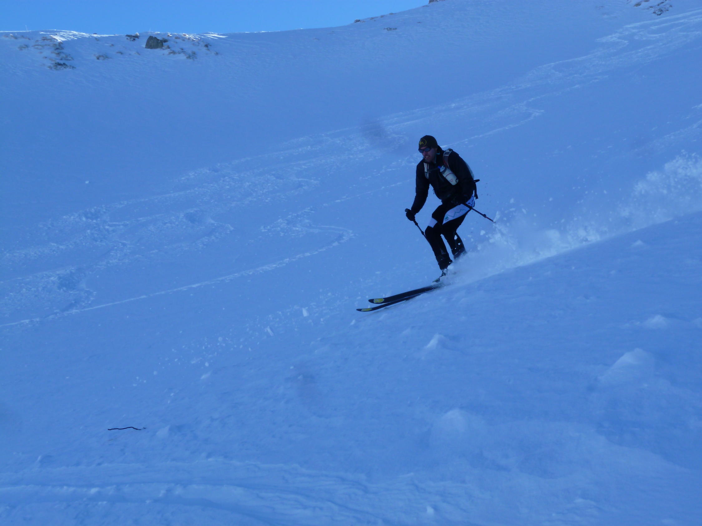 - N-Flanke: oben vom Wind zwar bearbeiteter aber genüsslicher (sogar mit denn Rennskis ein Top-Genuss!)Pulver, mitte war bereits bisschen "Tramschienenmässig" (für Rennski), unten wieder besser.