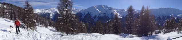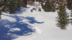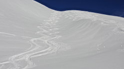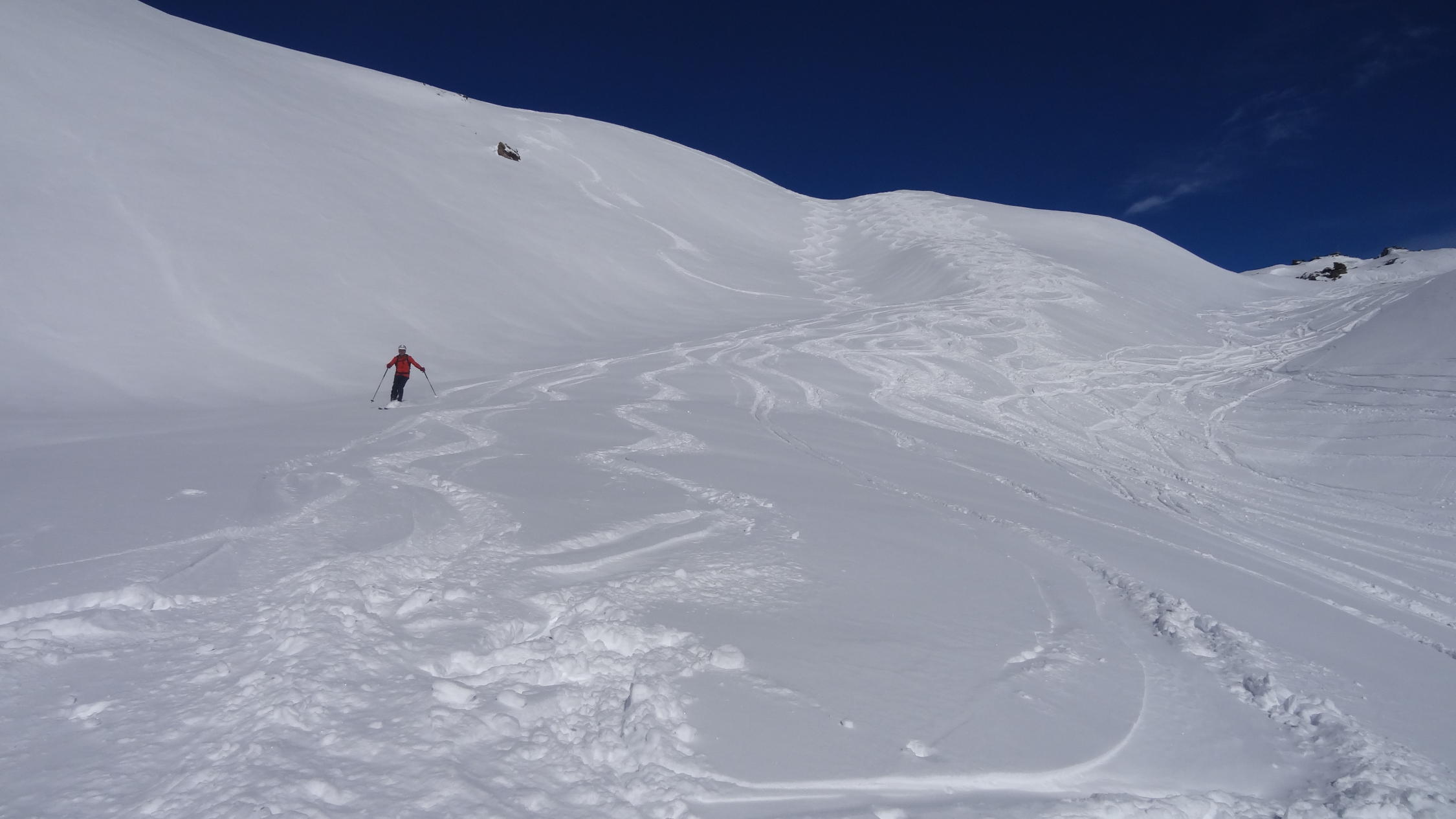 Oben leicht windgepresst, sonst meist pulvrig, im Wald wunderschön pulvrig, unten feucht aber immer gut fahrbar. Auf dem Gipfel nur leichter Wind und Sonnenschein den ganzen Nachmittag.