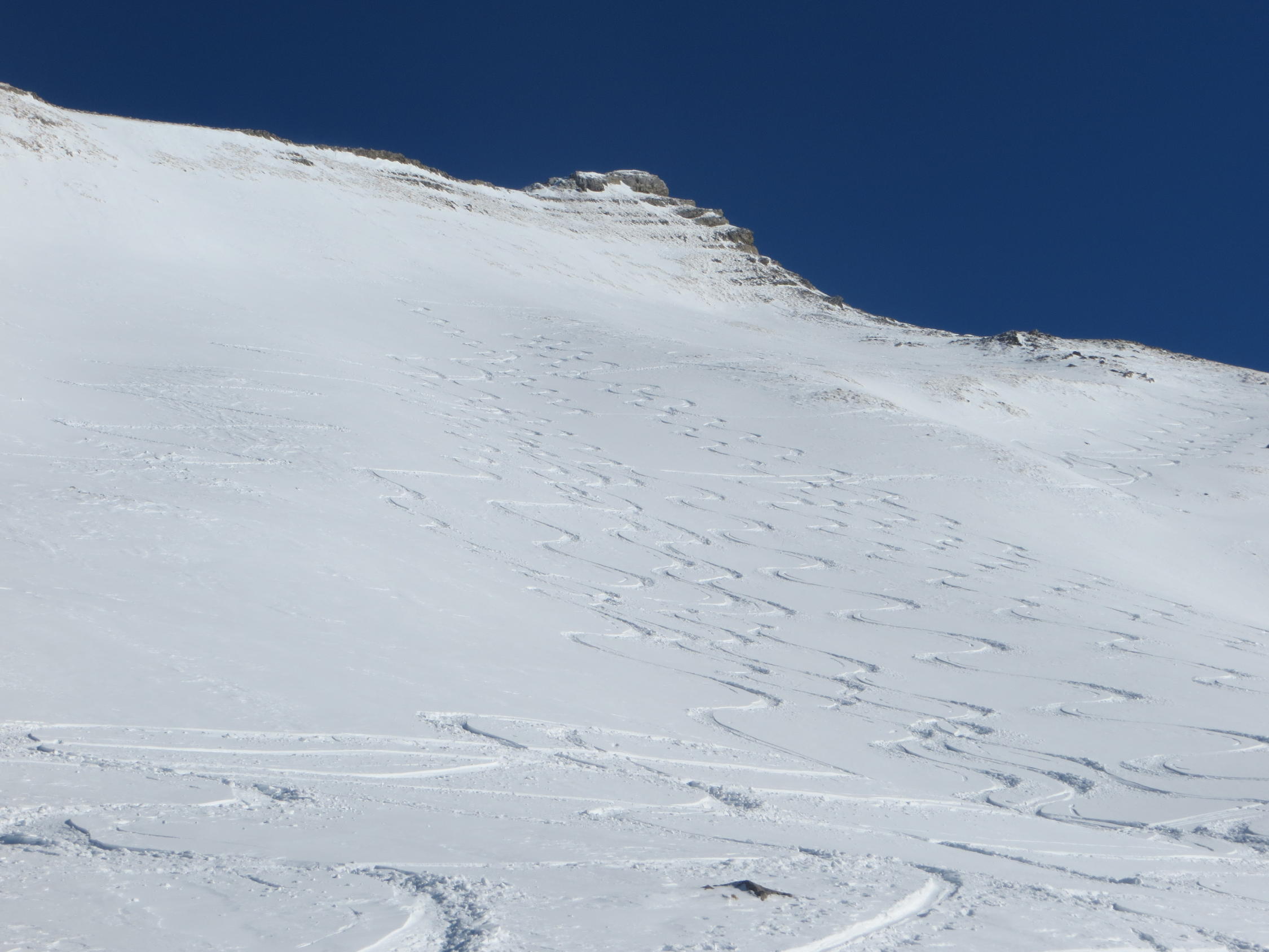 Haben den grössten Teil gespurt.Bester Pulver in der Abfahrt.Schnee unregelmässig, Triebschnee ist immer noch ein Thema. War aber heute mit mässig wohl richtig beurteilt auf dieser Route.