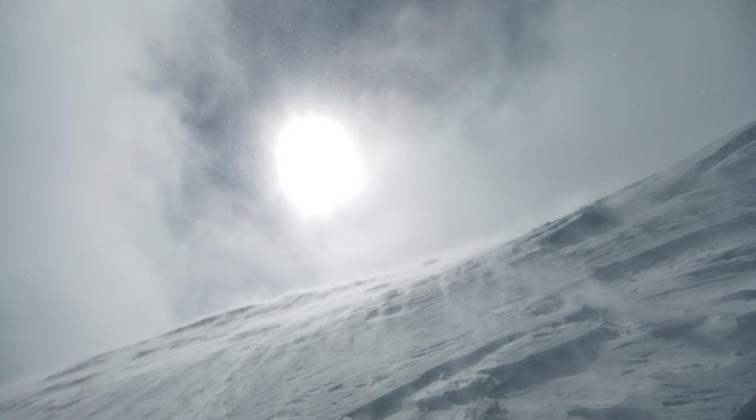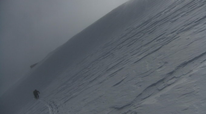 Bei schlechter werdender Sicht orientierte ich mich oberhalb 2600 m mehr links (nach Süd) zum felsigen Ostgrat, um unterhalb von diesem zu queren. Kurz davor überholten mich 2 Skitourenfahrer, die kurz vor dem Grat sich zur Umkehr entschlosssen. Es war nichts mehr zur Orientierung zu sehen. Wind und aufgewirbelter Schnee rundeten die Verhältnisse ab. Ich lief noch zum Felsgrat, um Kletterverhältnisse zu prüfen. Ließ dann davon ab und kehrte ca. 150 hm unterhalb des Gipfels um. Meine eigenen Spuren waren meist schon wieder verweht.