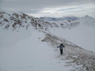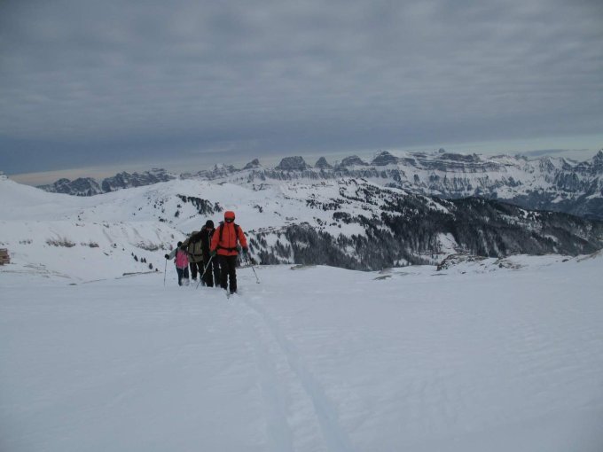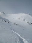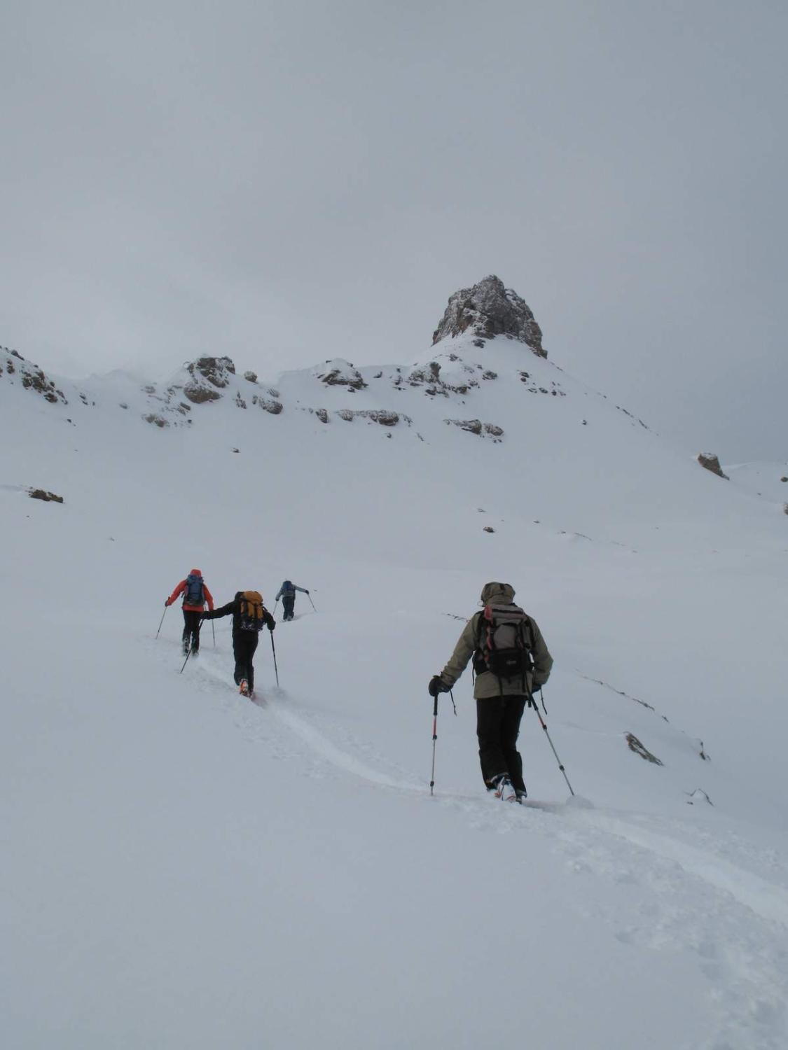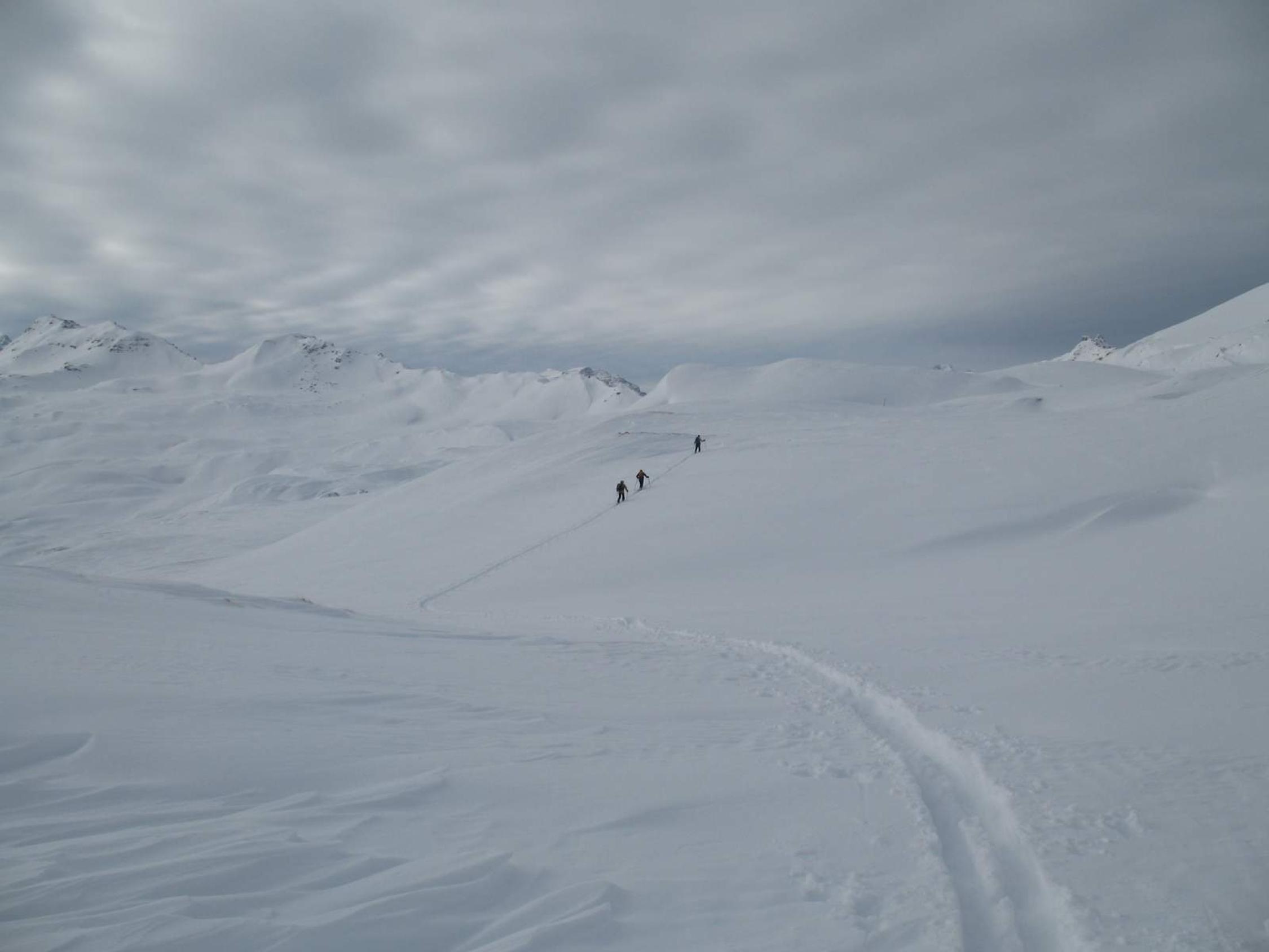 Ab Spitzmeilenhütte Richtung Ober Band, dann über Schönegg nördlich runter bis 2200m, Wiederaufstieg bis Wissmilenpass, Abfahrt auf 2320m und Aufstieg zum Sattel NW Spitzmeilen (2420m). Abfahrt zur Hütte.