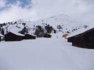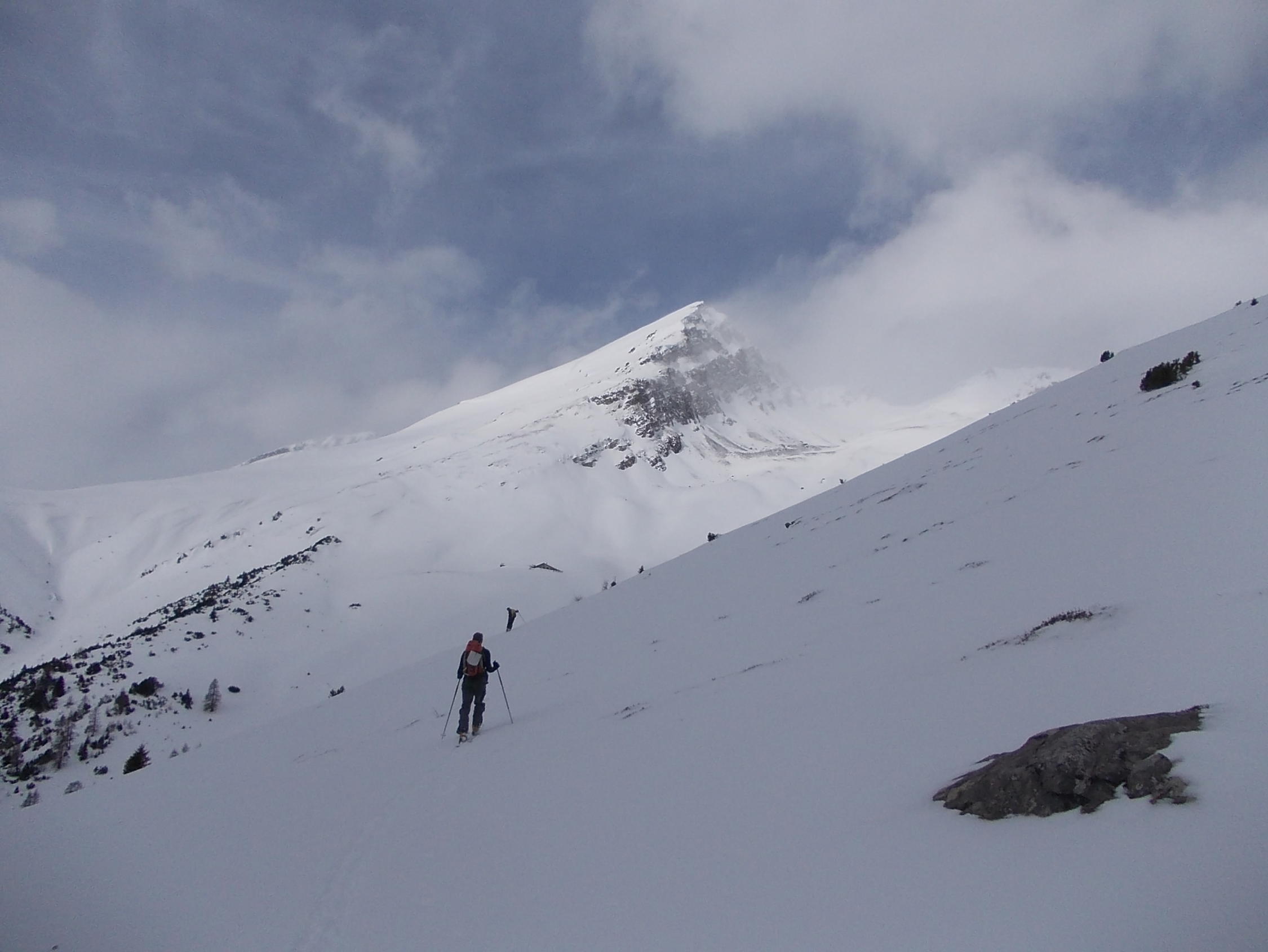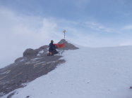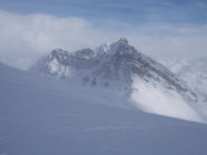 Unten etwas schwerer Schnee, oben pulvrig, aber verblasen, inhomogene Schneetiefen. Ab Wiesneralp blies der Föhn zunehmend mit der Höhe. Auf dem Gipfel erreichte er Sturmstärken bis etwa 120 km, wir konnten uns dort kaum mehr auf den Beinen halten. Leider blieb die Aussicht, wie etwa zu den Bergüner Stöcken, welche der Sandhubel normalerweise gewährt, durch tiefe Wolken eingeschränkt.