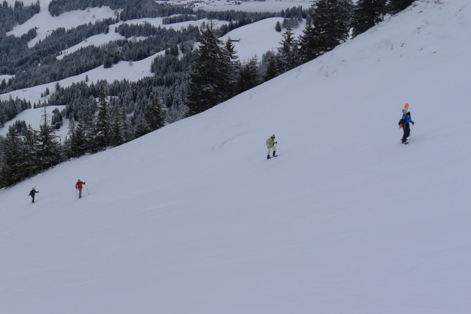 Bei Pt. 1372 (west. Chräwäldli) ein kleines Schneebrett ausgelöst. Trotz Einzelbegehung und Lawinenstufe 1 (ab 2000 m.ü.M. Stufe 2).