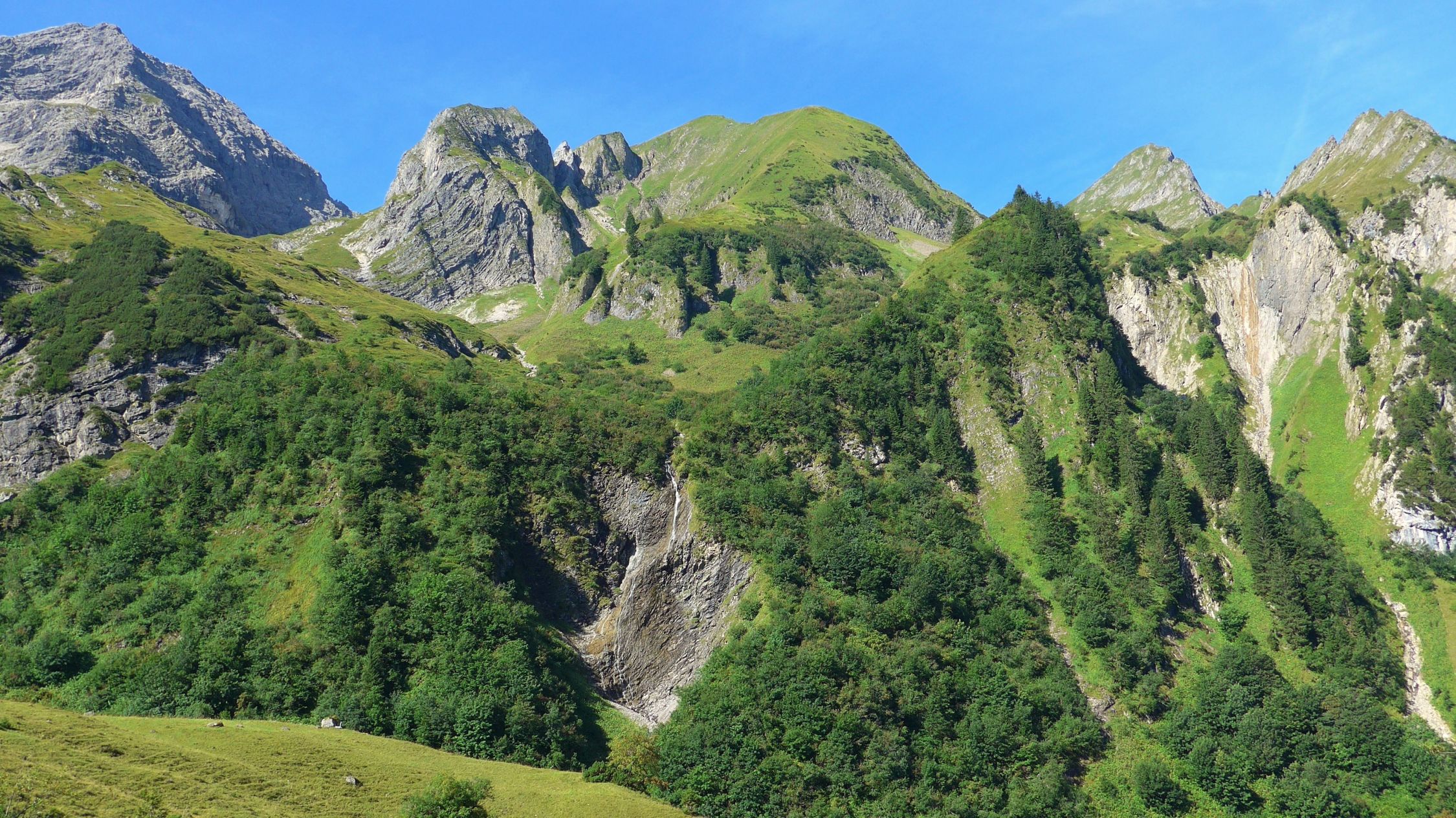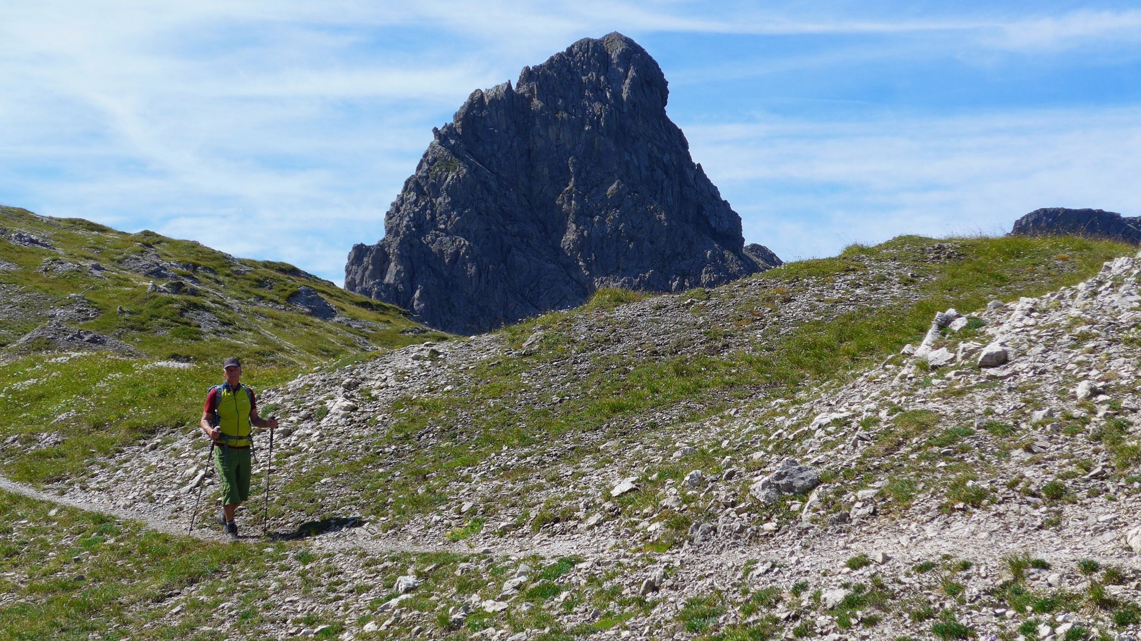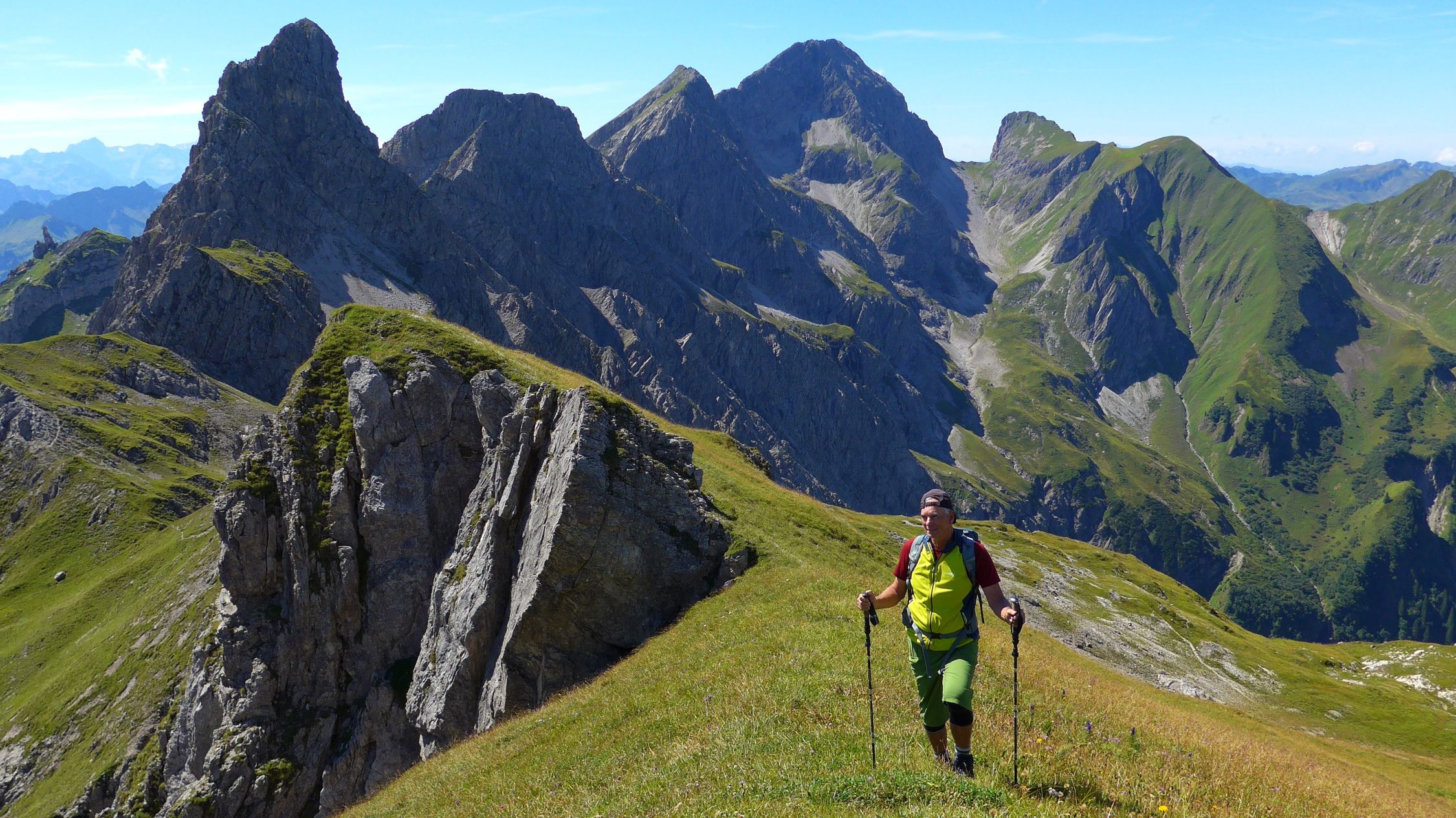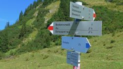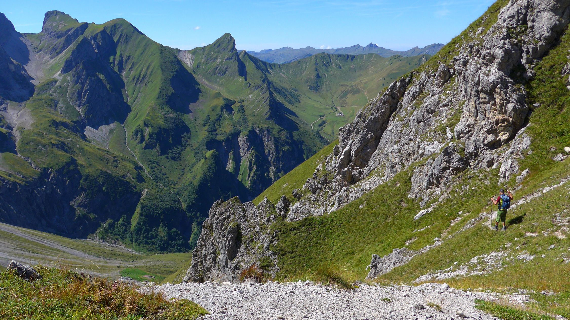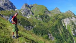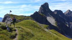 Bald nach der Töbelealpe schraubt sich der Pfad ordentlich steil ins Töbelejoch hinauf. Jenseits bietet sich ein herrlicher Blick ins Grosse Walsertal hinab. Vom Joch folgen wir nun spärlichen Spuren, dem Grat entlang, bis zum Gipfel des Ruchwannekopfes.
