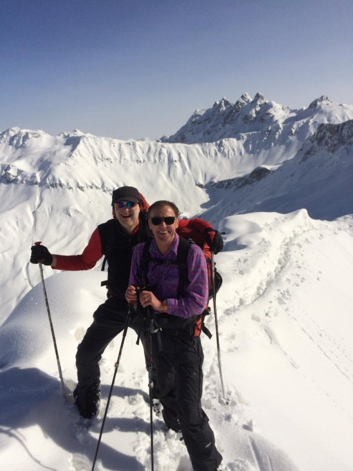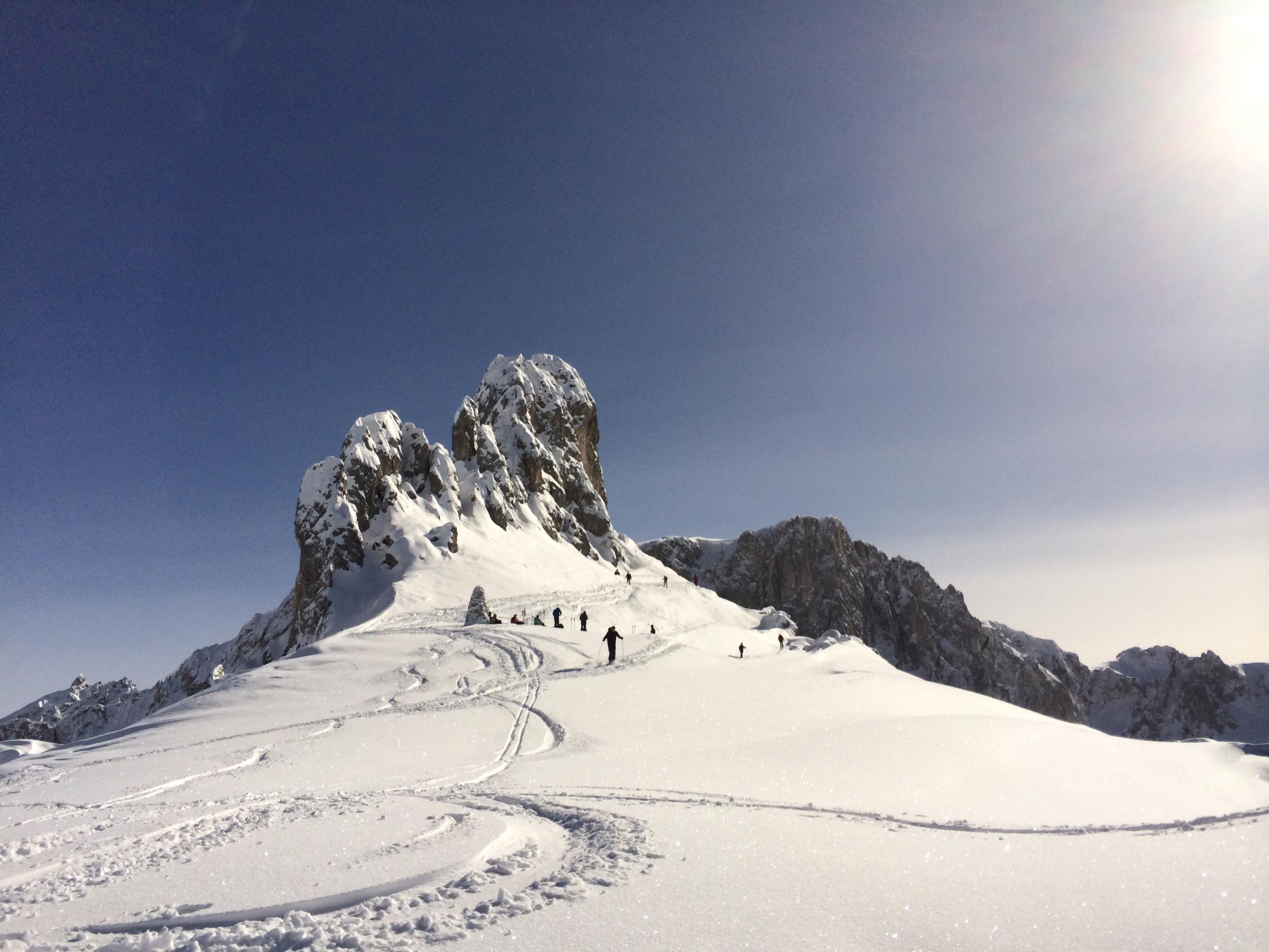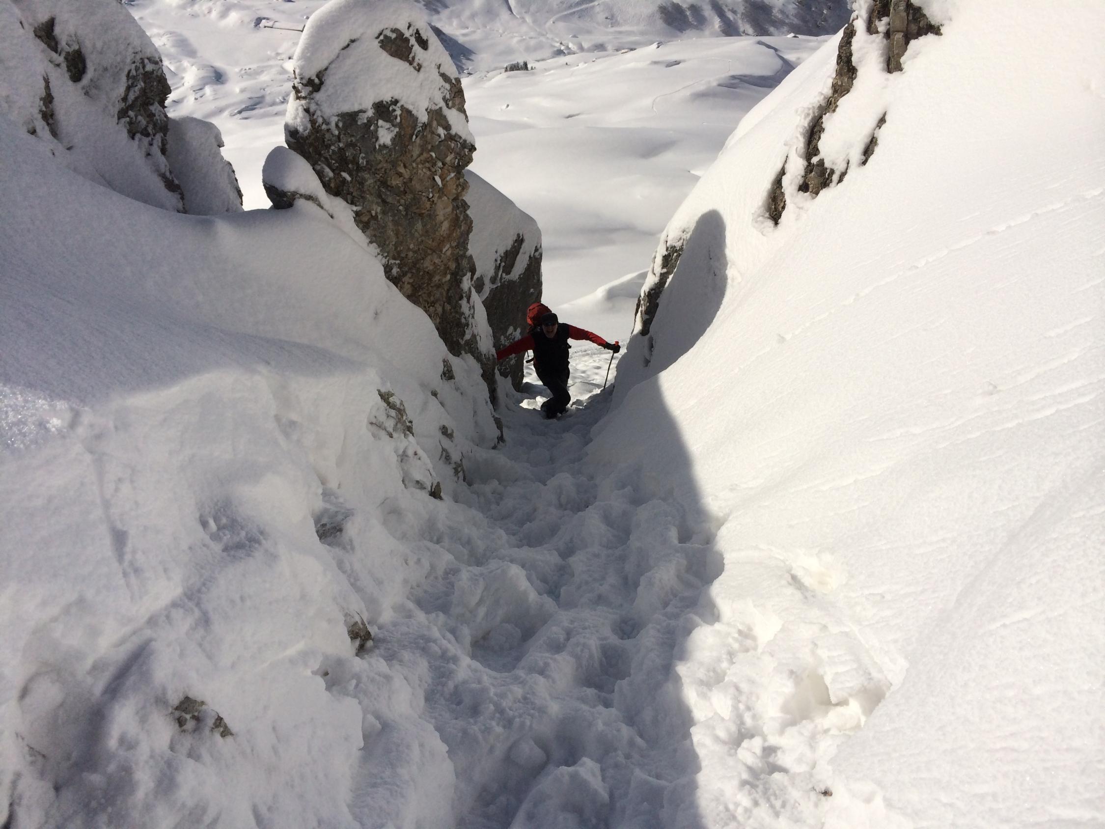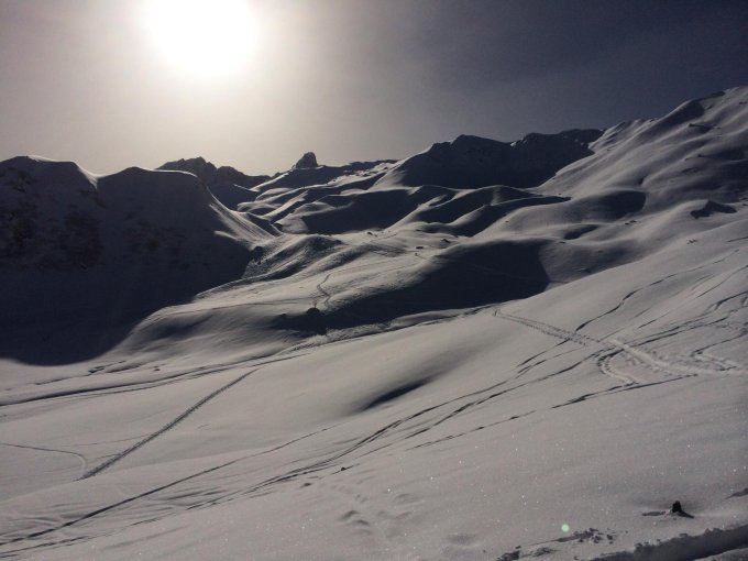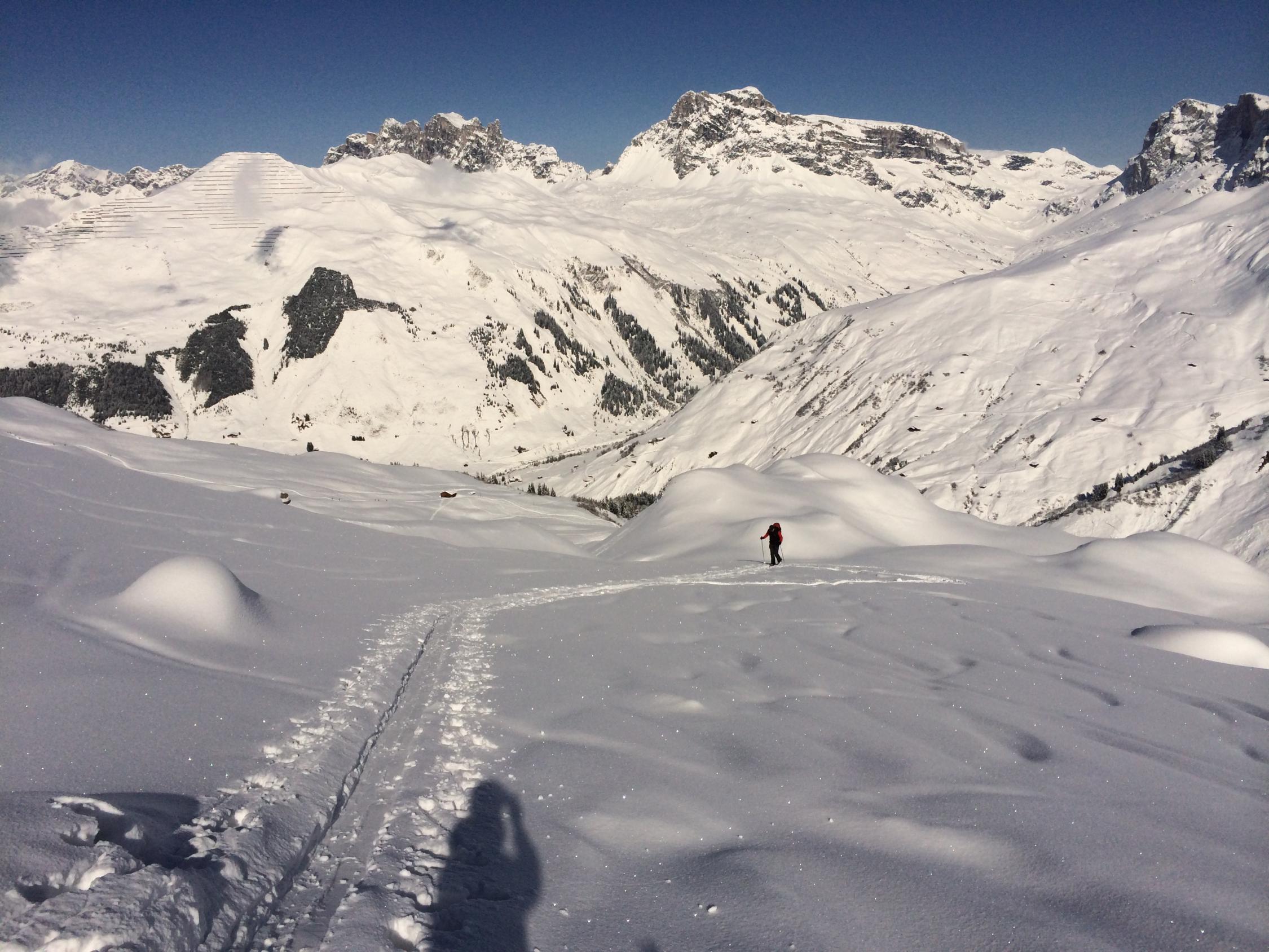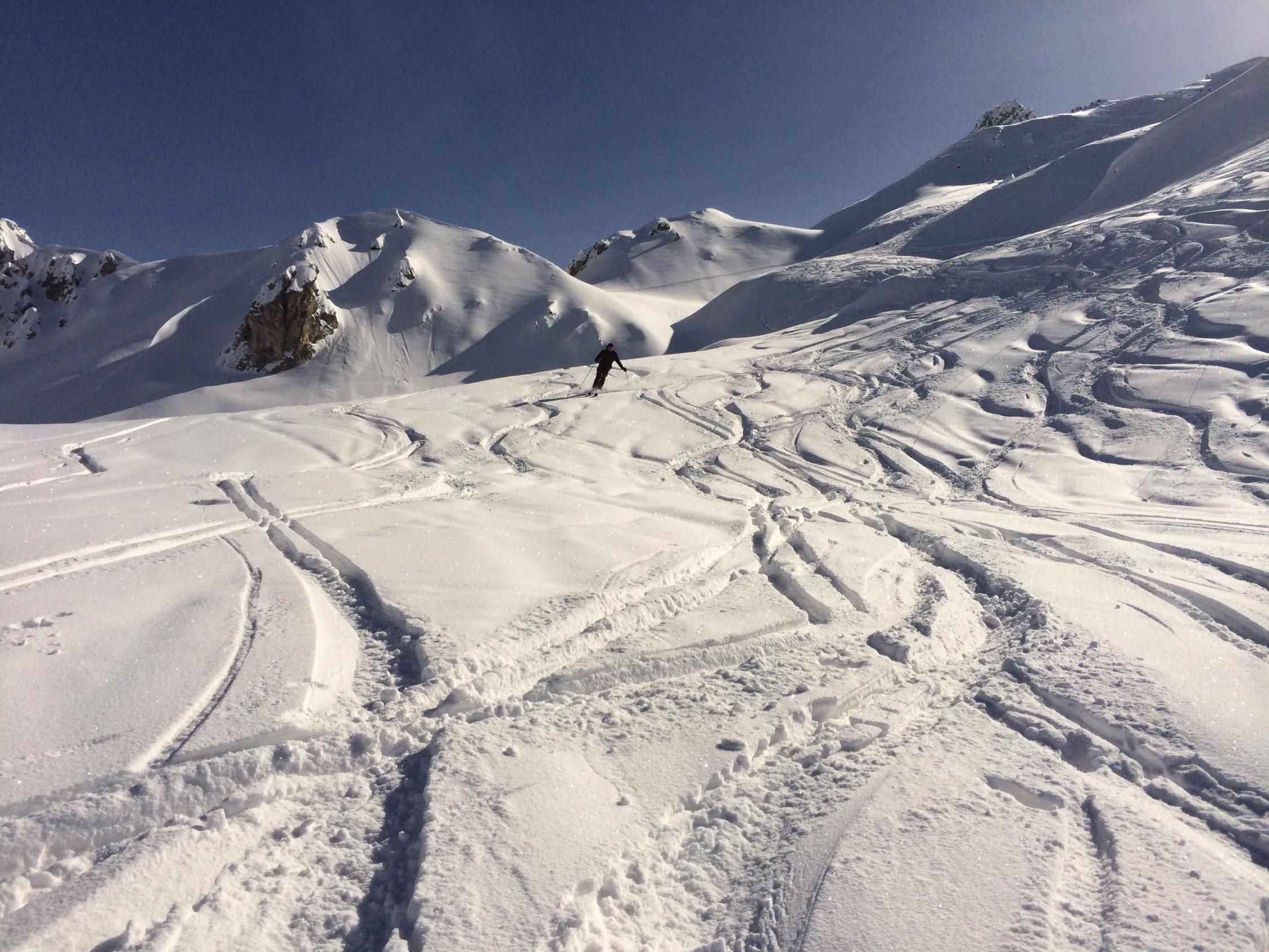 Feine Pulverauflage; sehr gut zu fahren. Oben am Kamm verstecken sich heimtückisch Steine unter dem Neuschnee
