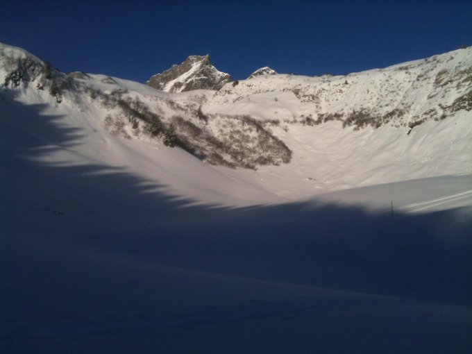 Gut gesetzter Pulver in den Schatten- und Sonnabgewendeten Hängen.