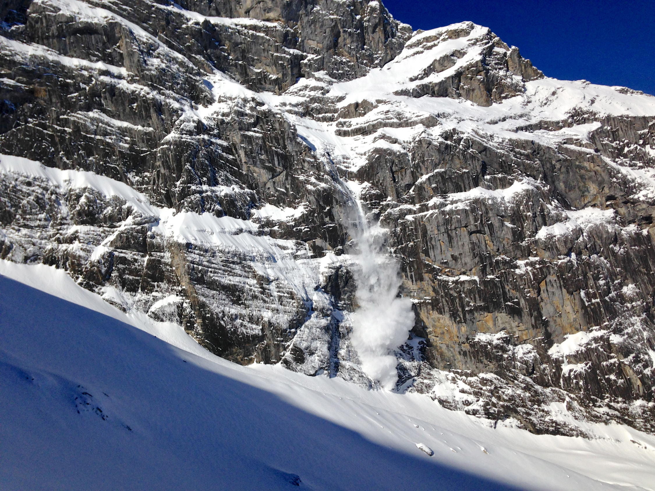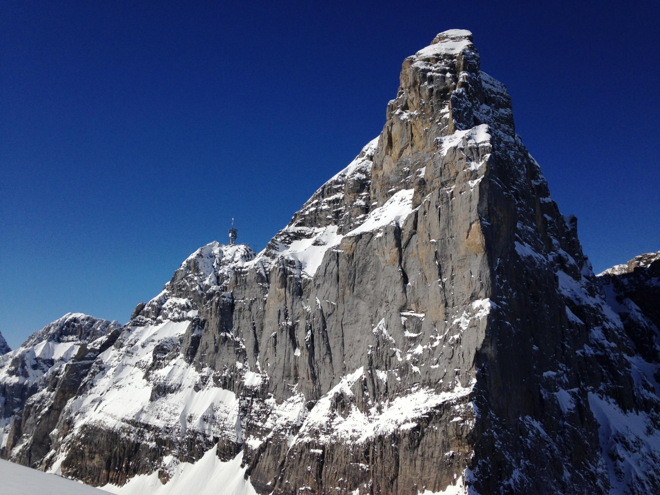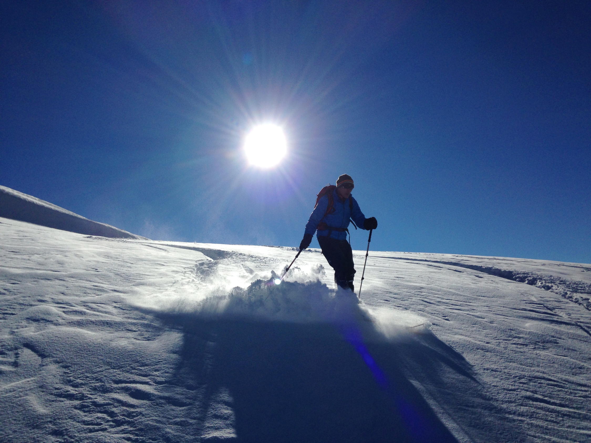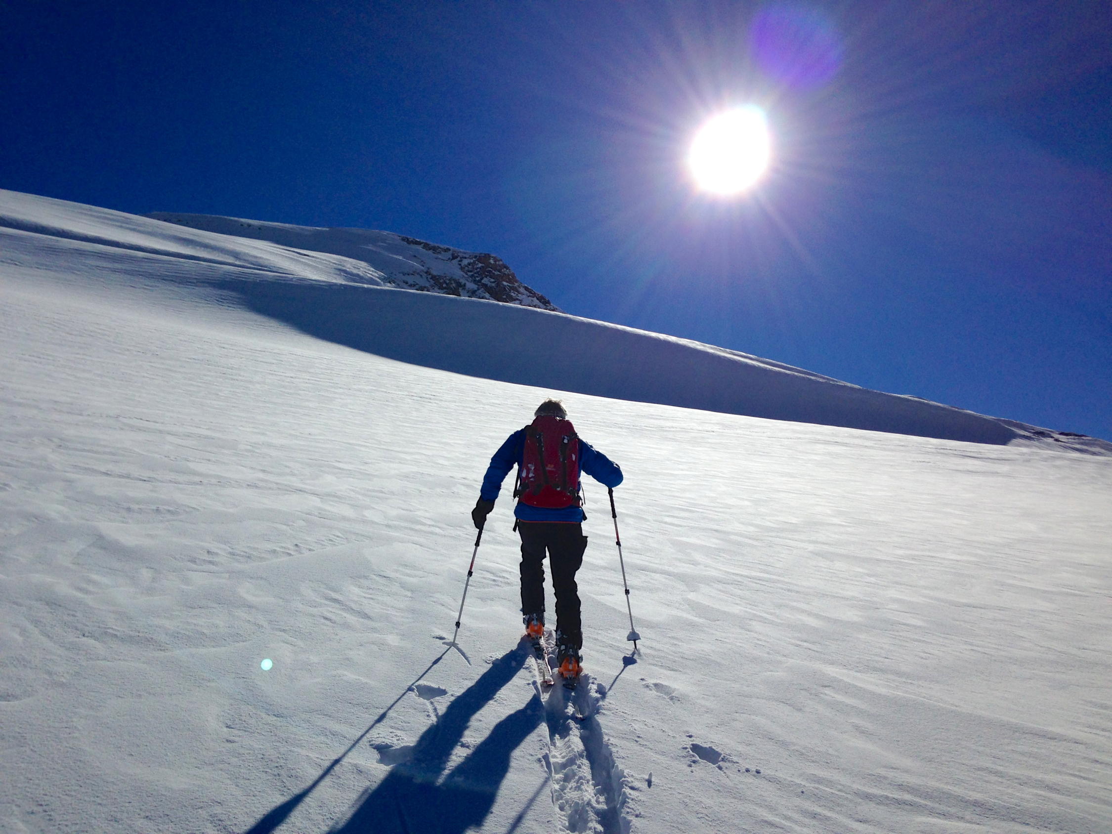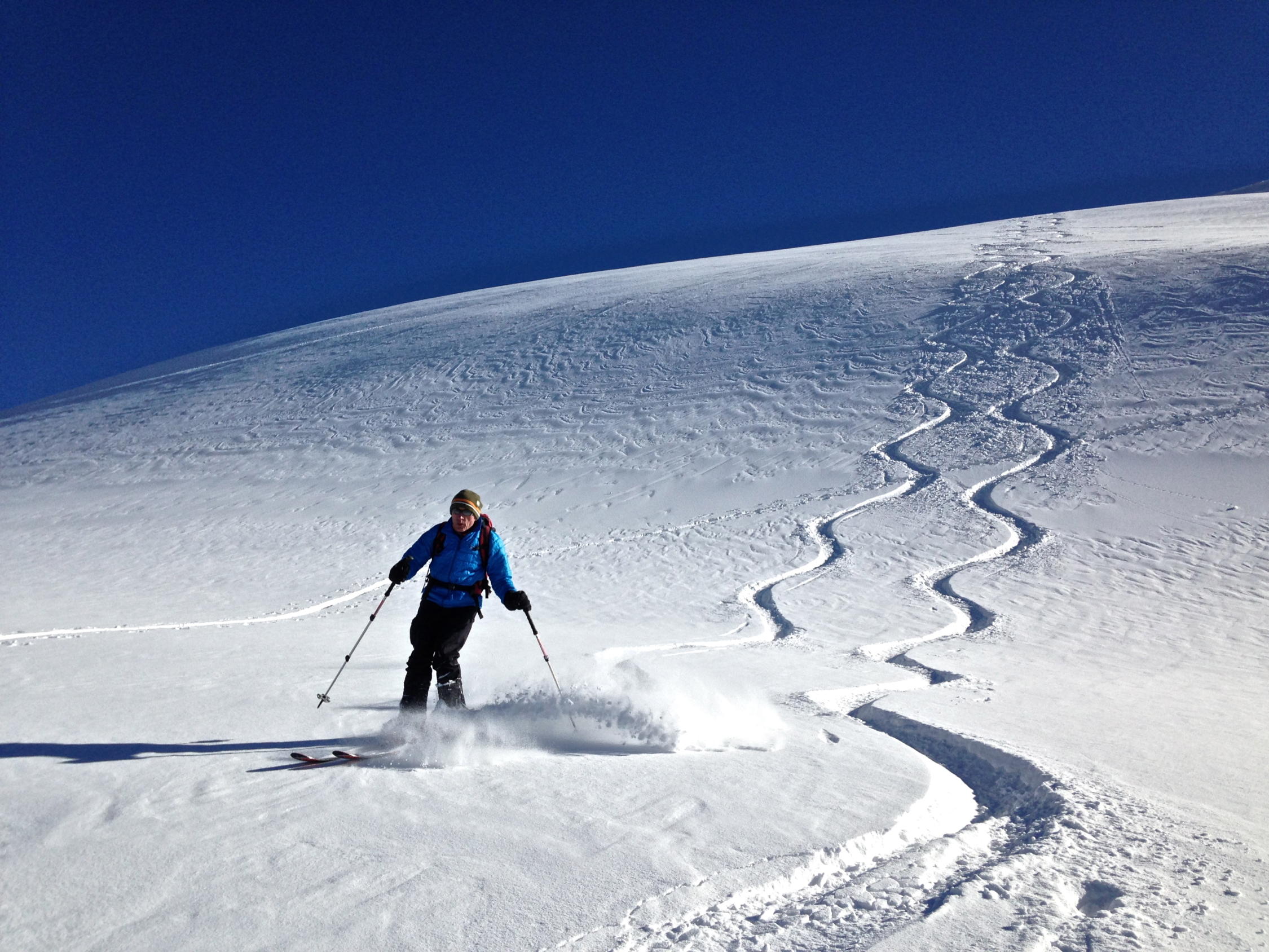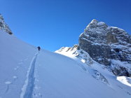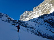 20 - 30 cm Pulverschnee. Mühsame Spurarbeit. Wir waren alleine. Die Abfahrt im Pulver war ein Genuss. Im östlichen, schattigen und windgeschützten Teil des Tales waren die Pulverbedingungen am besten. Leider kamen zwei Gruppen mit Bergführern vom Titlis, was die Hänge nicht verbesserte. In den untersten 300 Hm tragender, gefrorener Nassschnee. Den ganzen Tag herrschten sehr tiefe Temperaturen.