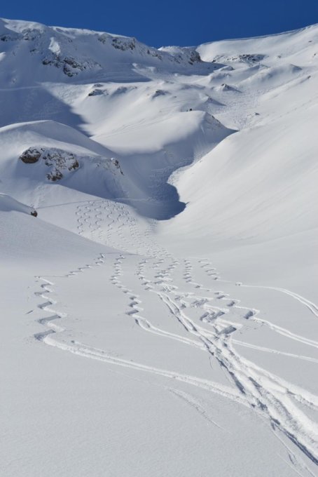 Es sieht alles sehr schön weiss aus, der SE-Grat vom Ammertenpass aus hat aber einige Steine nur weiss gezuckert. Im Aufstieg kein Problem. Abfahrt zuoberst über den NE-Grat, dann den E-Hang hinunter in die erste Mulde. Wenn man in der Abfahrt die obersten ca 70Hm ohne Steinkontakt gemeistert hat, hat man Glück gehabt. Darunter war es heute ein Pulvergenuss...