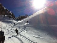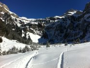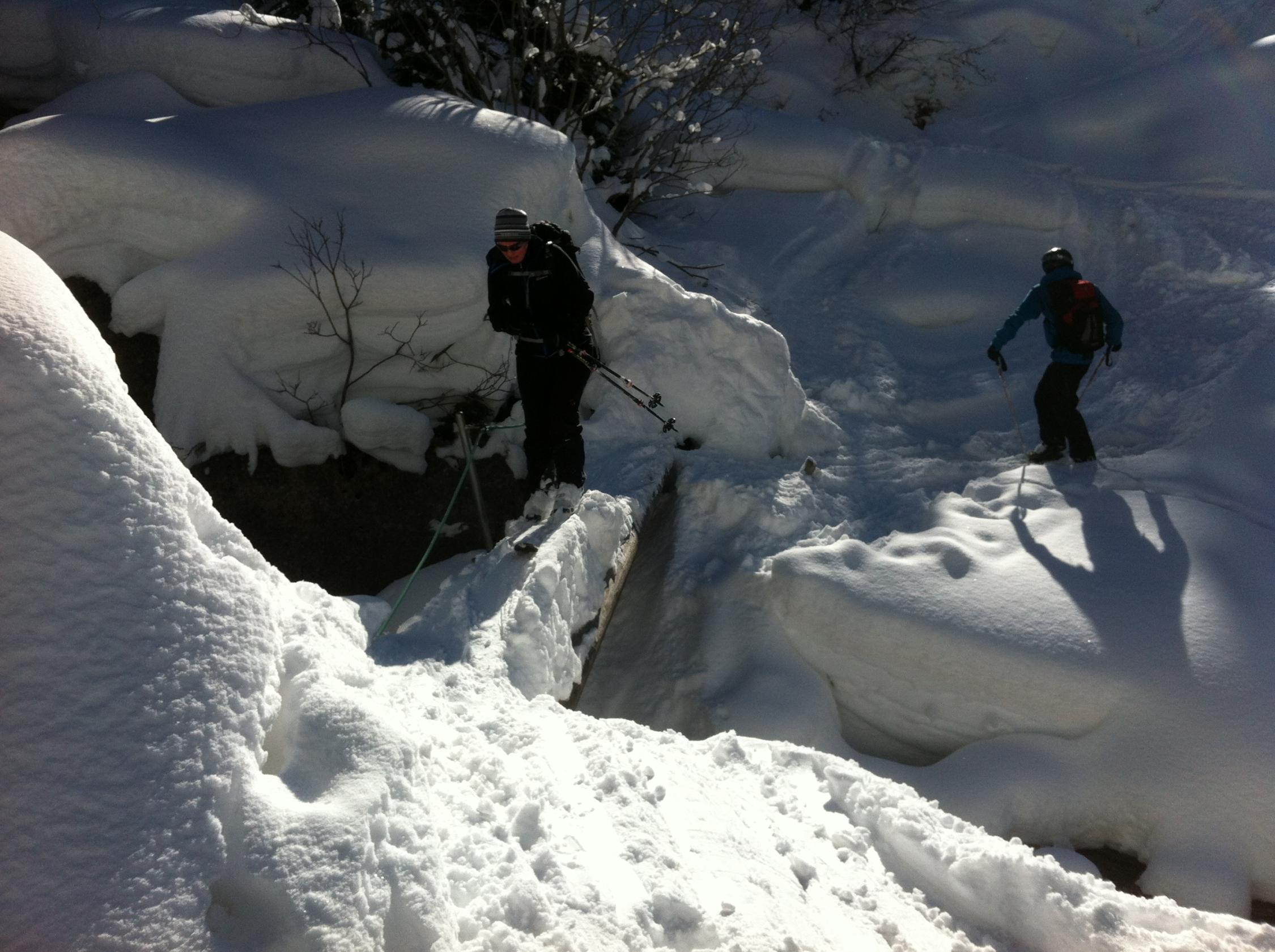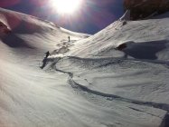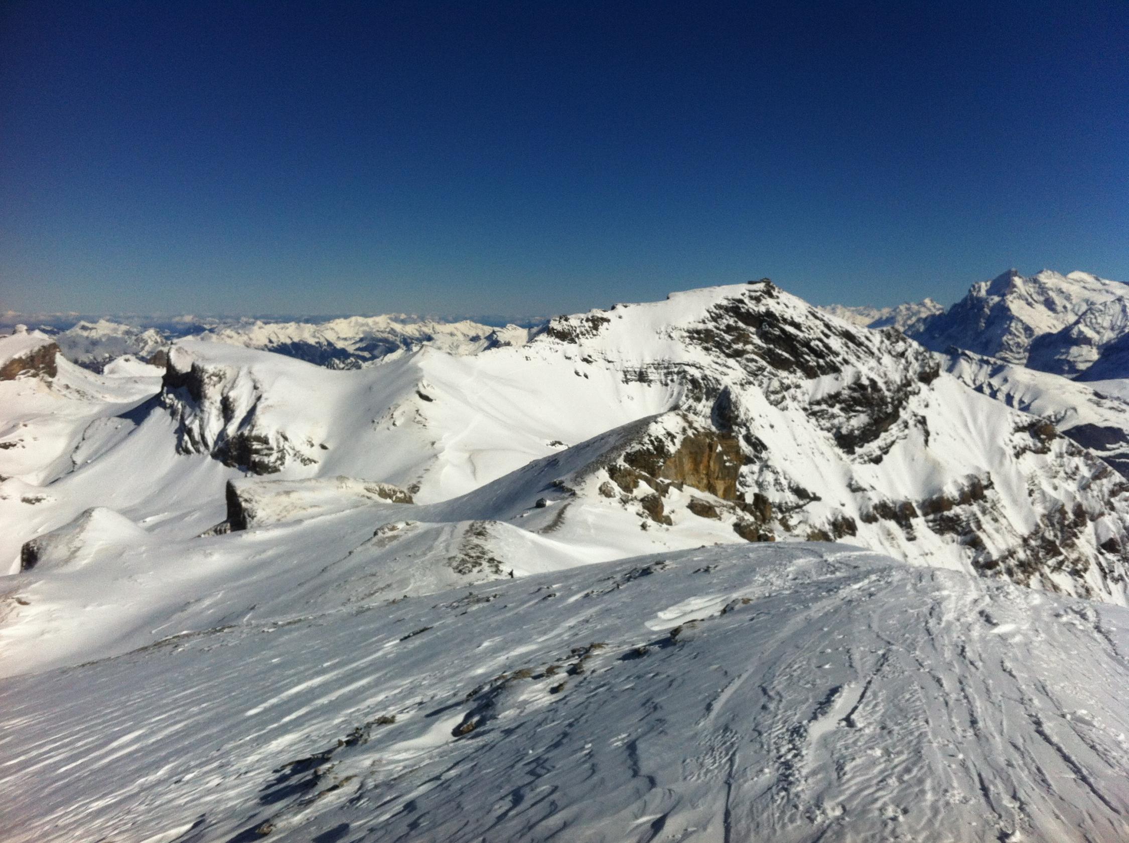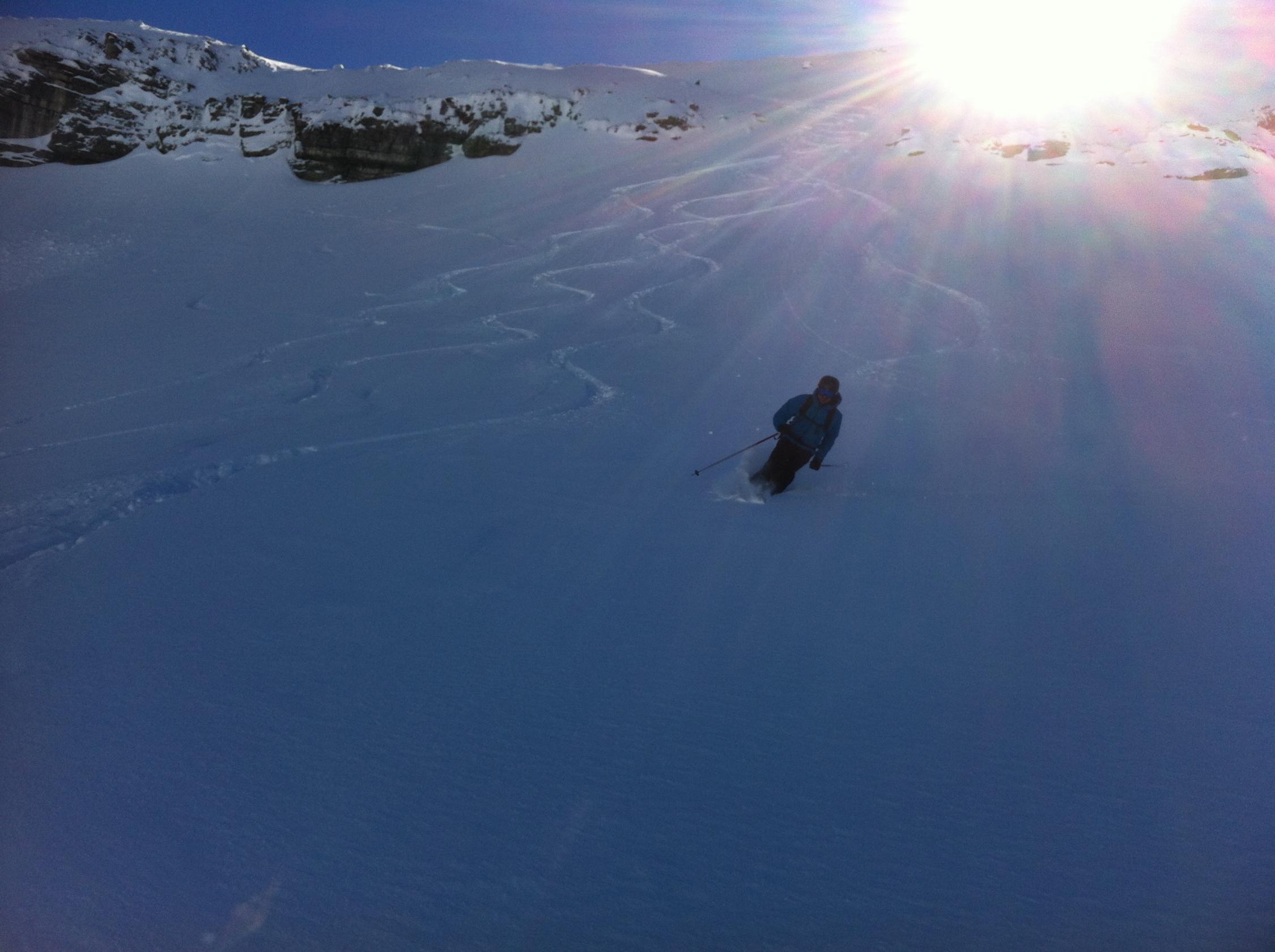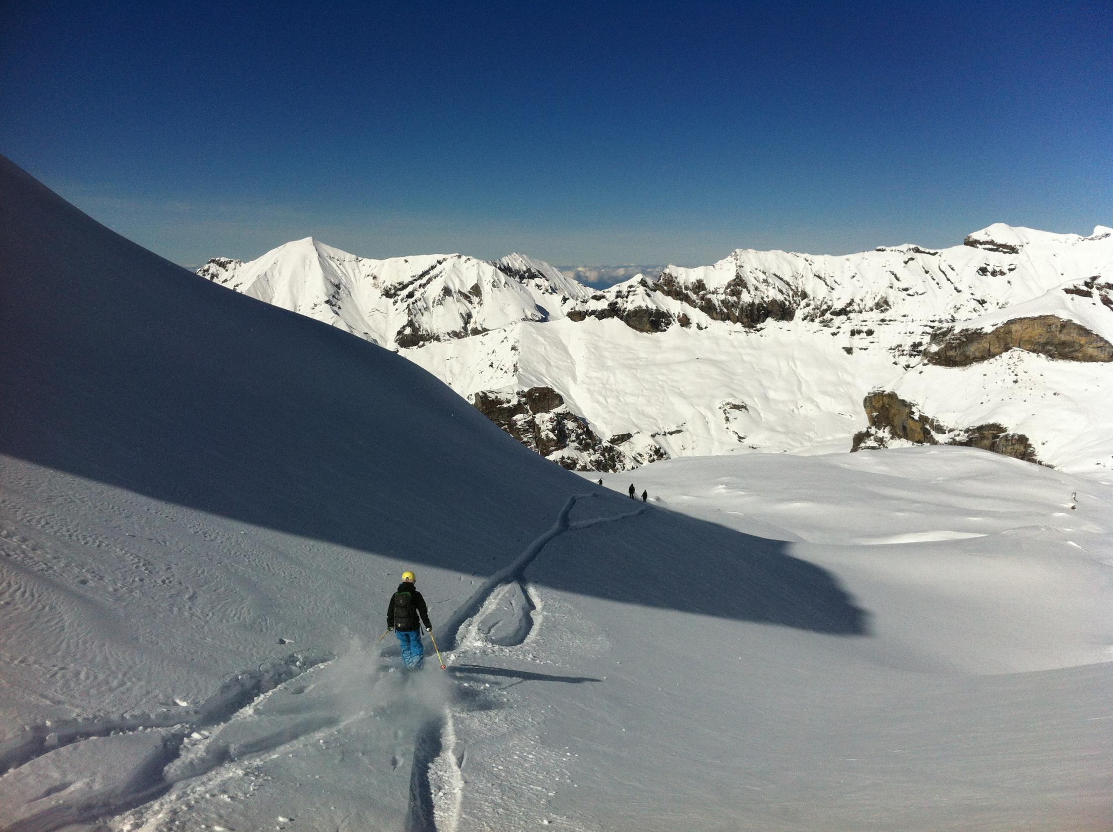 Ganz am Grat etwas Windharst und dann ganz toller, teilweise knietiefer Pulverschnee bis in den Spiggengrund.