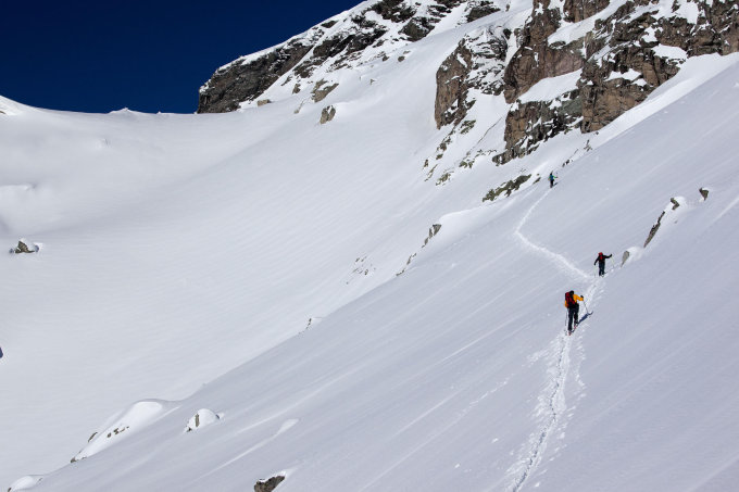 Abfahrt oben Pulver, weiter unten durch die wärmenden Sonnenstrahlen immer weicher werdend. Abfahrt vom Skidepot um 11:30 Uhr definitiv eine Stunde zu spät.