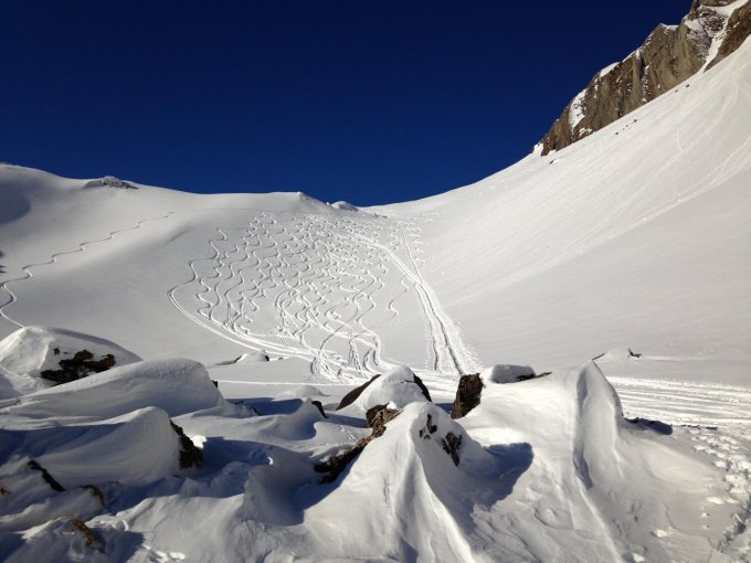 Pulver gut auf der Nordabfahrt, oben 20, unten 5 cm. Die Abfahrt entlang der Aufstiegsroute ist schon stark verfahren.
