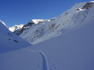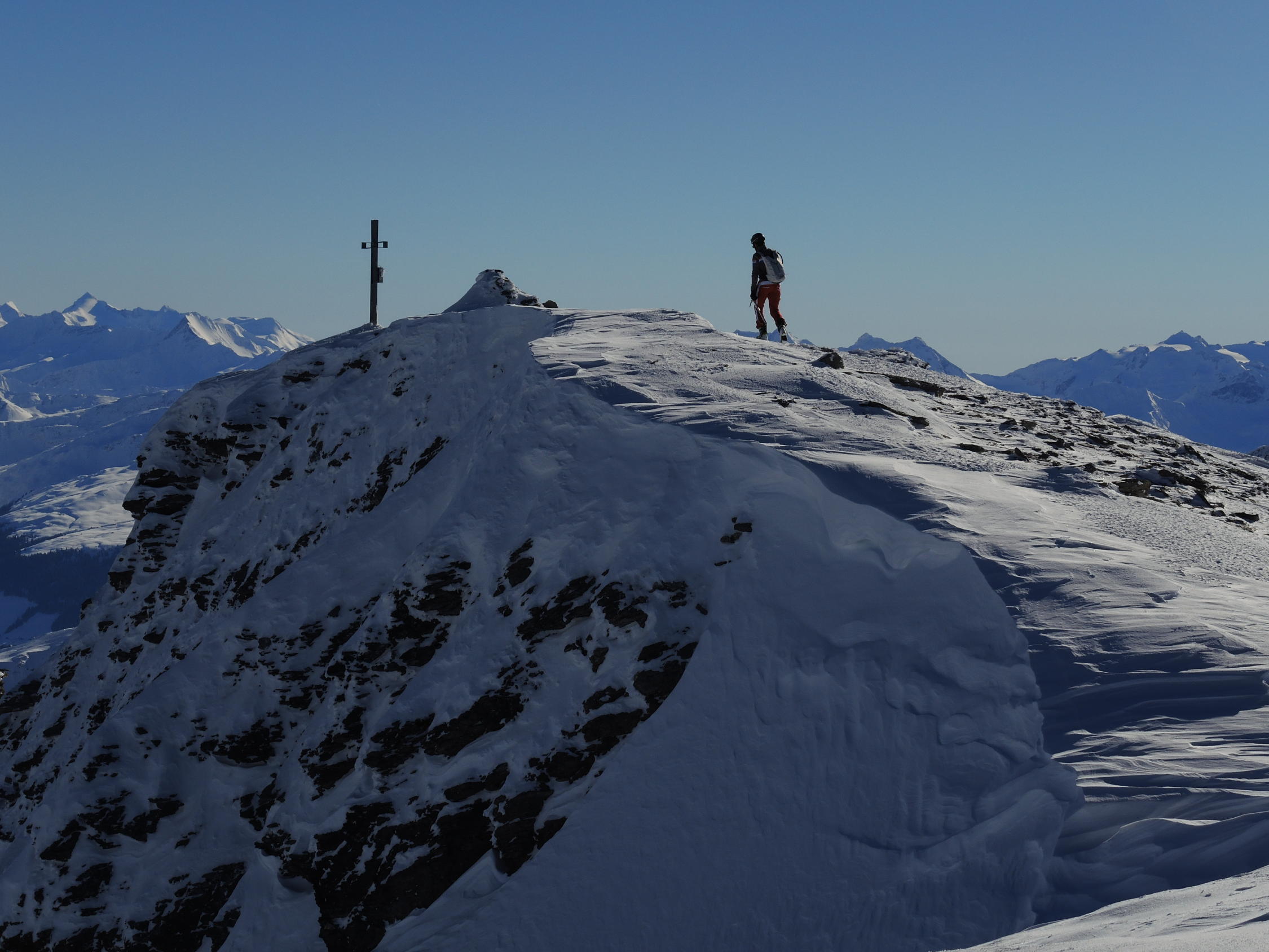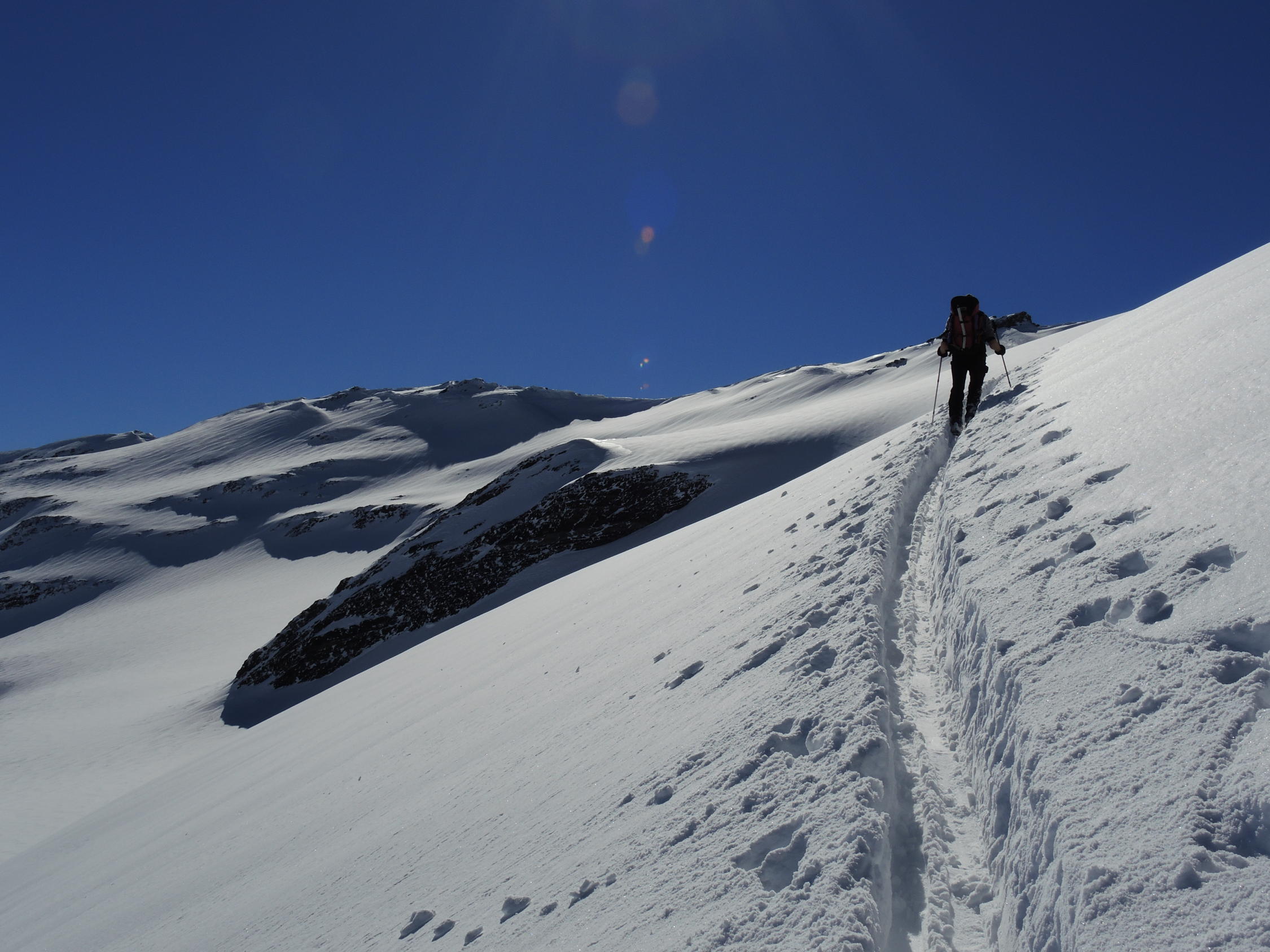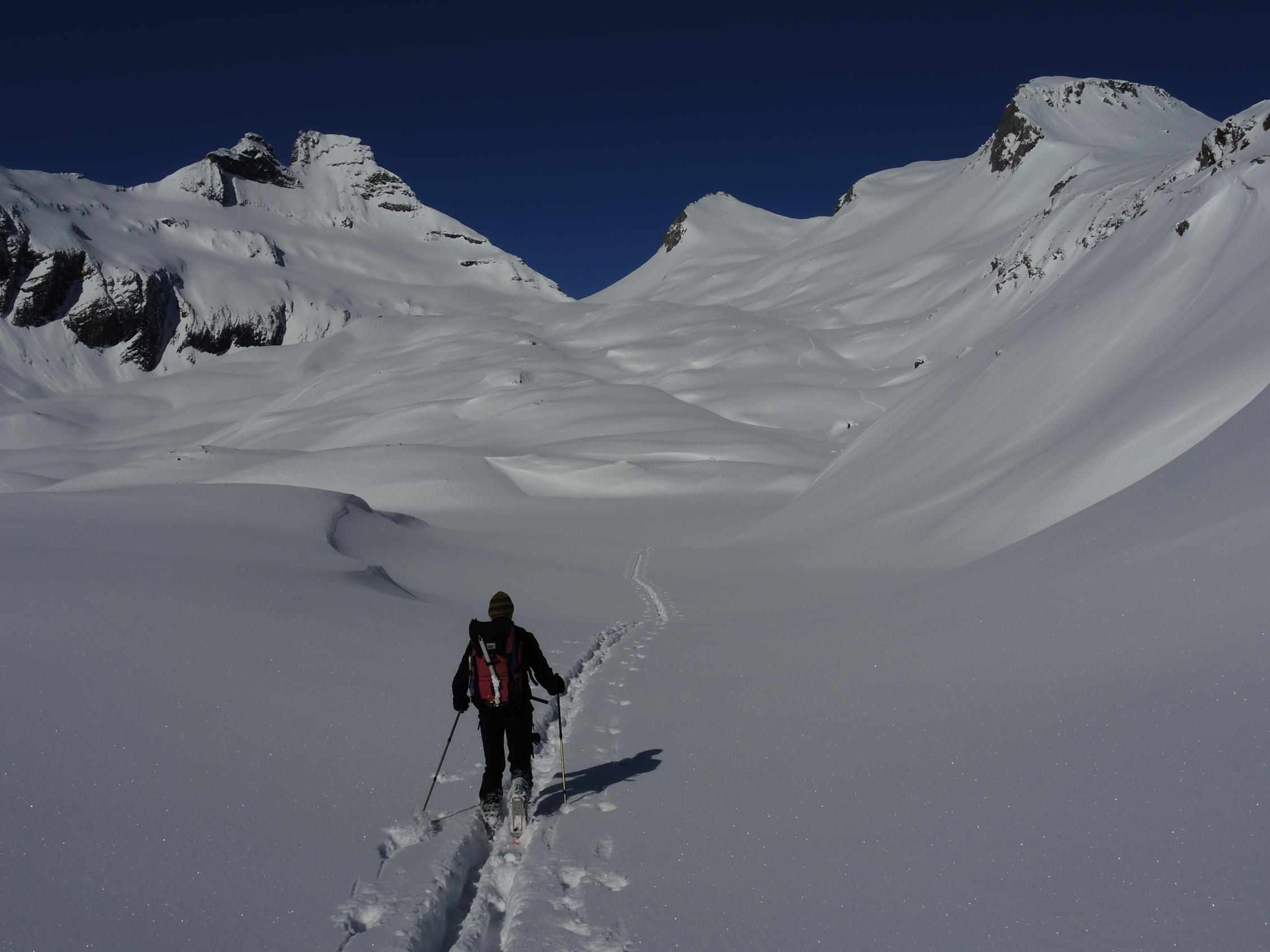 Start um 7:35 in Wichlen. Vor uns war ein Einzelgänger unterwegs, der fast die komplette Route in unglaublichem Tempo gespurt hat. Danke Urs, das war klasse! Ein zweiter Einzelgänger kam uns nach und wir waren schließlich zu viert am Gipfel. Die angegebene Führerzeit ist sehr sportlich, wir brauchten 3,5h zum Panixerpass und nochmal 4h zum Gipfel. Im Gifelbüchle war noch kein Eintrag für dieses Jahr.