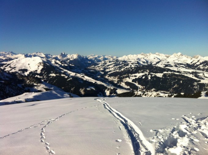 Pulverschnee ohne Ende. Daher gleich 2 Mal hochgefellt. 1. Abfahrt Grat West bis Hütte (Pt. 2057). Gwächte zahm. 2. Abfahrt direkt vom Gipfel.