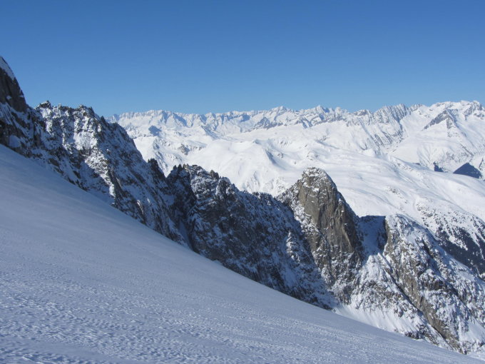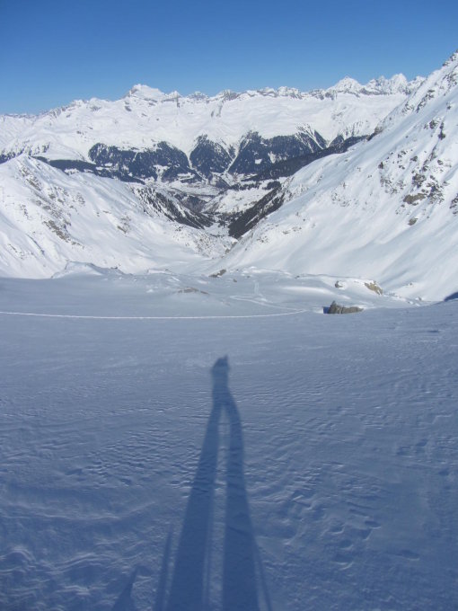 Gipfelhang etwas gedeckelt. Rest traumhafter, tiefer Pulver. Ausreichend Schnee bis nach Curaglias.