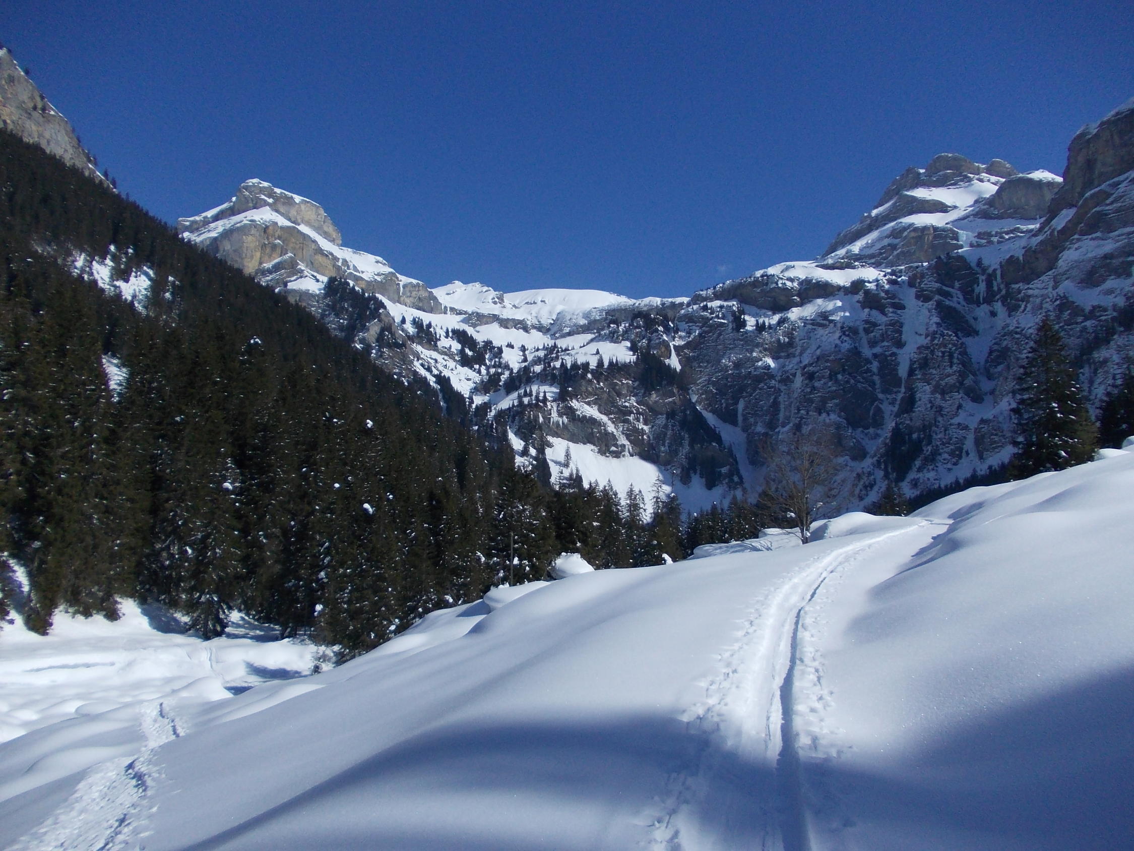 Forststrasse durch den Spiggegrund nach Kiental geht sehr gut zum Fahren. Am Schluss eine Viertelstunde Ski tragen.