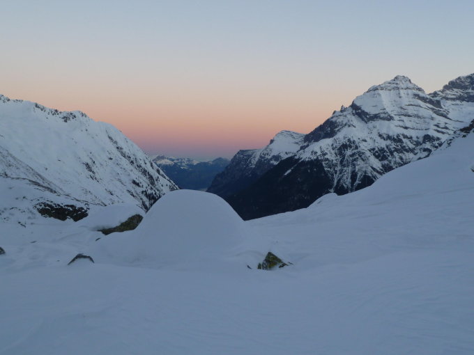 Genügend Schnee. Spurarbeit zum Chrüzlipass (viel Wind), dann herrliche Pulverschneeabfahr ins Val Stremm. Auf fast durchweg guter Spur zum Oberalpstock. Die Abfahrt erfolgte über den Staldenfirn ins Maderanertal. Die Einfahrt auf den Staldenfirn war problemlos. Trotz vieler Spuren gab es immer noch herrlich unversperrten Pulver. Ein installiertes Seil kurz vor erreichen des Talgrundes war hilfreich beim überwinden der Steilstelle. 15 min mussten die Ski bis zur Seilbahnstation Golzeren getragen werden.
