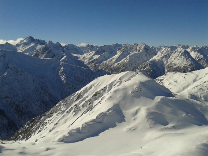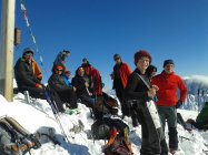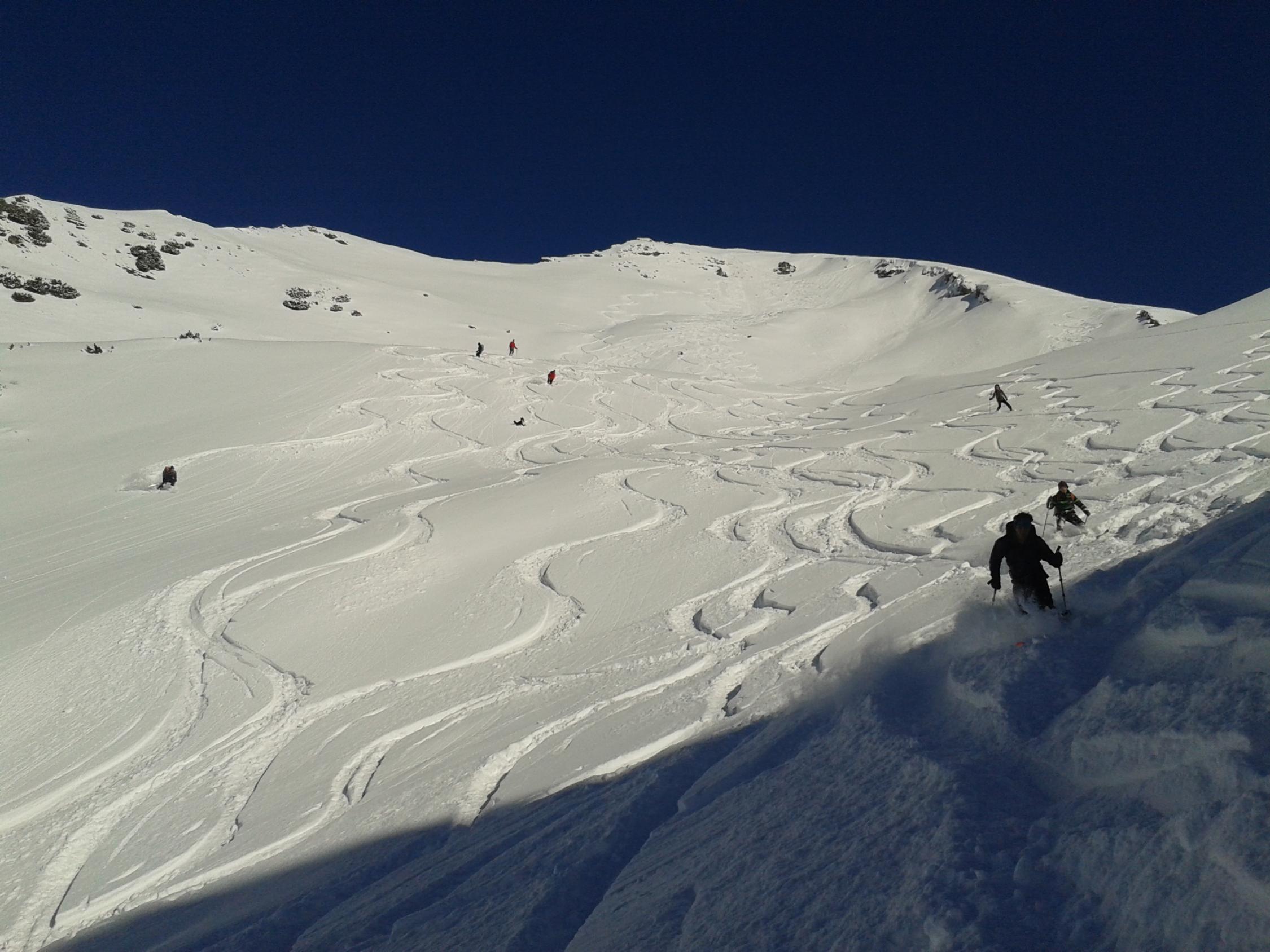ausreichend Schnee gleich von der Straße weg (auch für die Abfahrt OK). im gesamten nordseitigen Kar bis zu 30cm Pulverschnee. ab Scharte über den Gipfelhang auch Neuschnee, der aber bereits etwas schwerer wurde und teilweise auf der harten Altschneedecke abrutscht. die letzten 10min. zu Fuß, da kein (Schnee)untergrund vorhanden.
