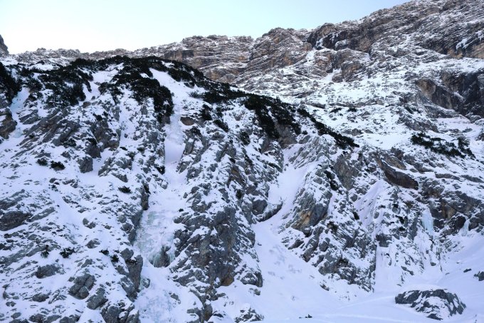Unterer Teil, normaler Einstieg: Fettes Eis, einiges an Pulver in den Rinnen.