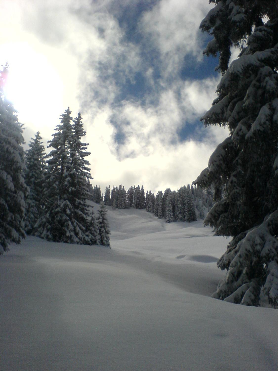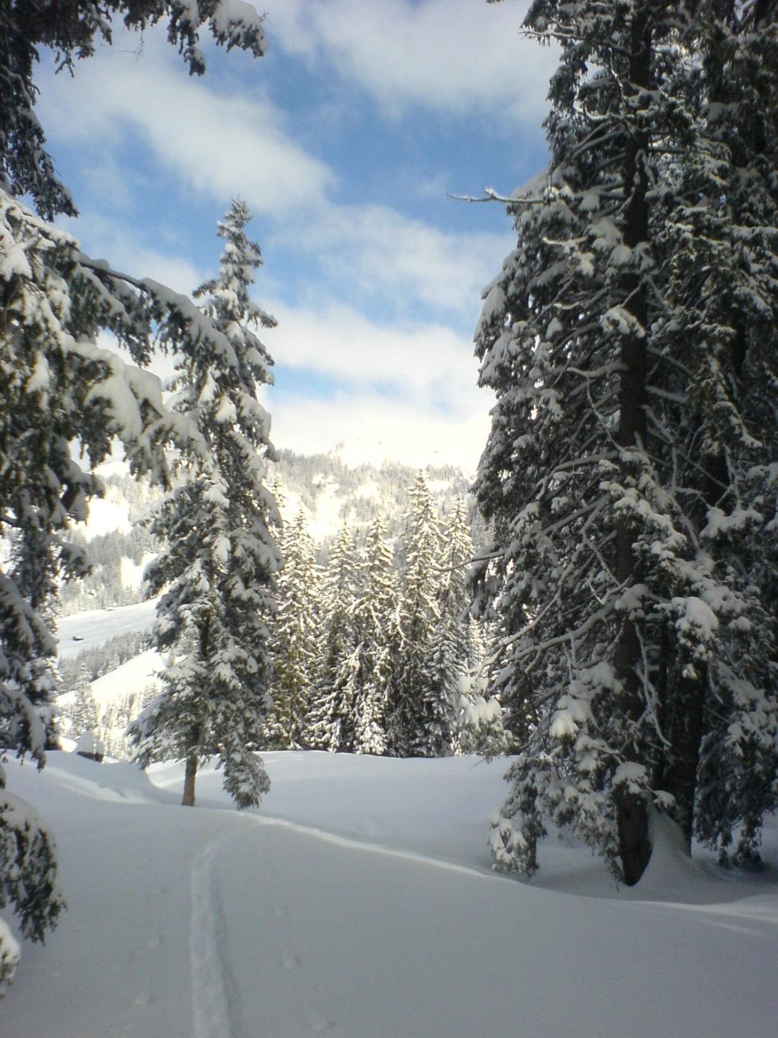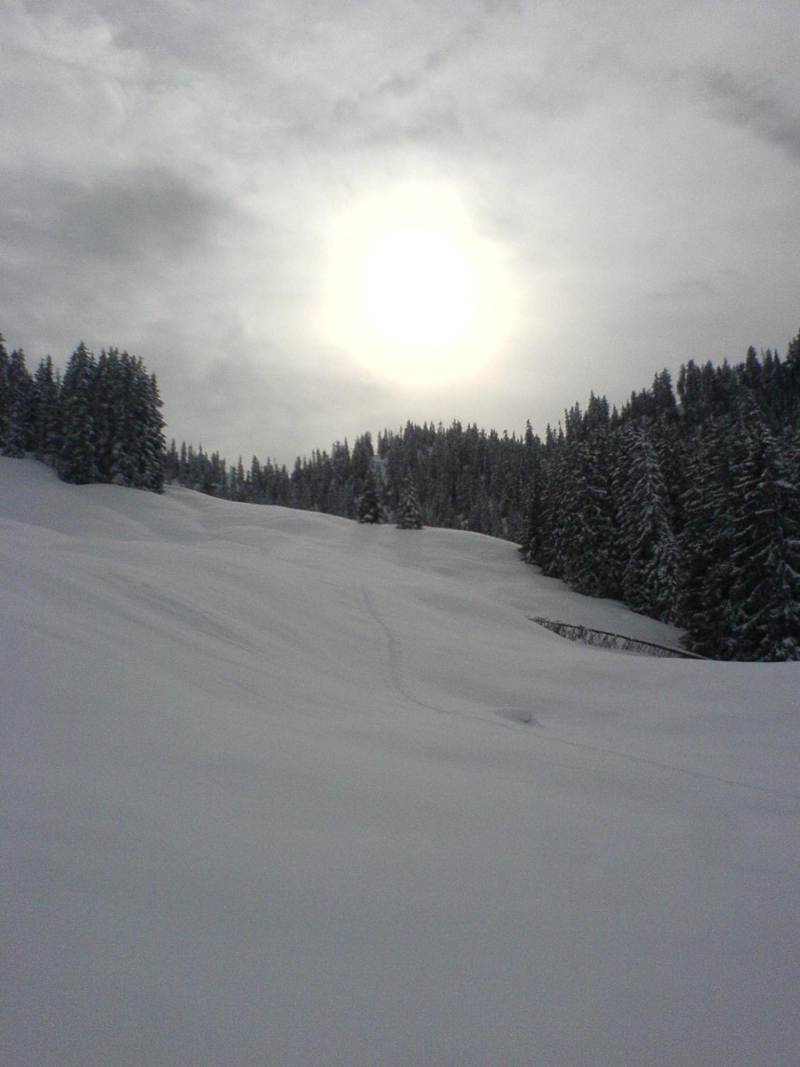 Abfahrt: Powder-Genuss vom Feinsten, in den flacheren Abschnitten fast zu viel Neuschnee! Unterhalb 1400m zunehmend pappig.