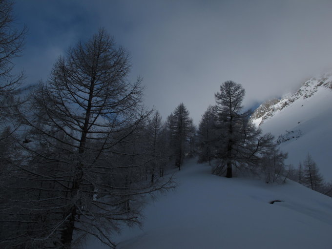 Keine. Durch den starken Fallwind hat sich im Couloir gegen das Hillejoch schon einiges an Triebschnee abgelagert