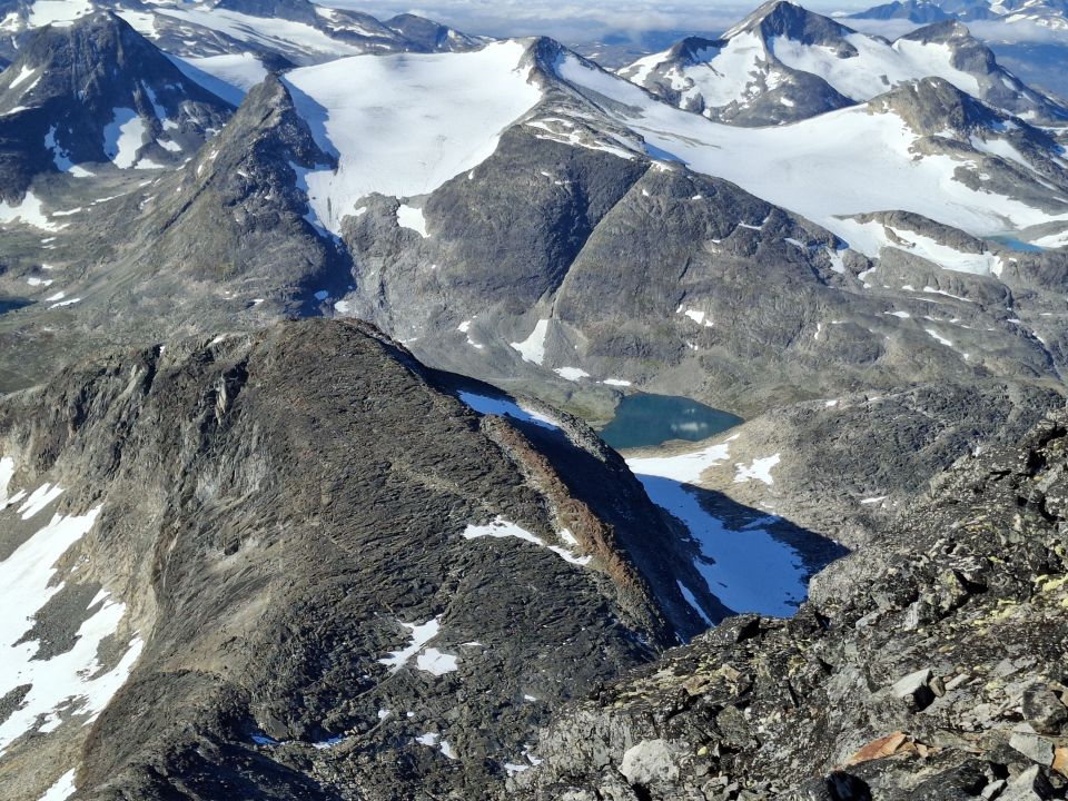 Kurz nach Høgvaglen befindet man sich nur noch im steinigen Gelände, kaum mehr Pfadspuren. Das Gelände ist kompakt. Bei Nässe aufgrund Flechten wohl eher rutschig. Wenige Schneefelder die hart waren, aber auch ohne Steigeisen gut zu gehen. Alle Schneefelder können gut umgangen werden.