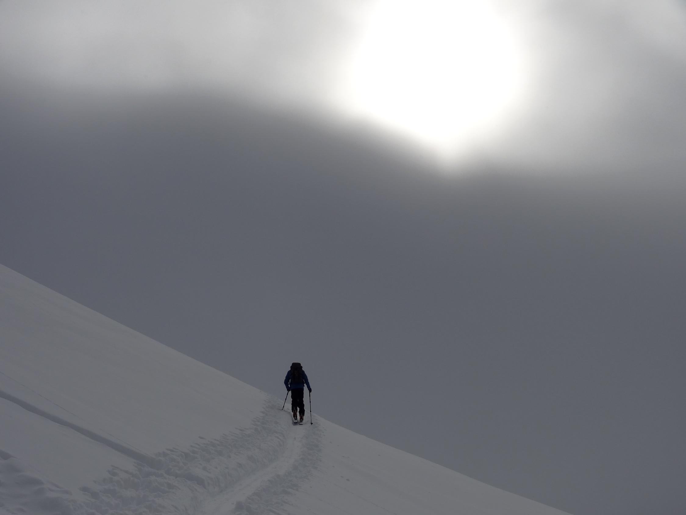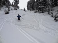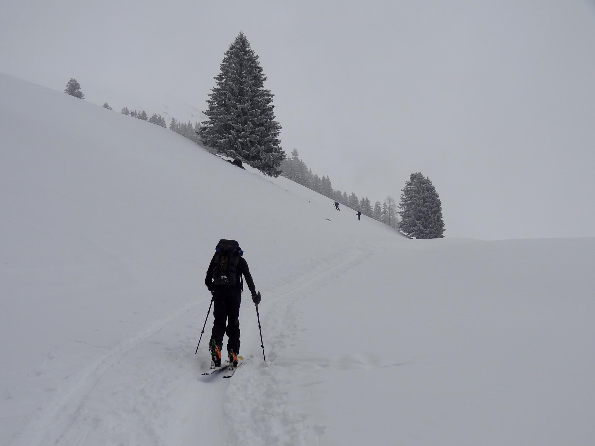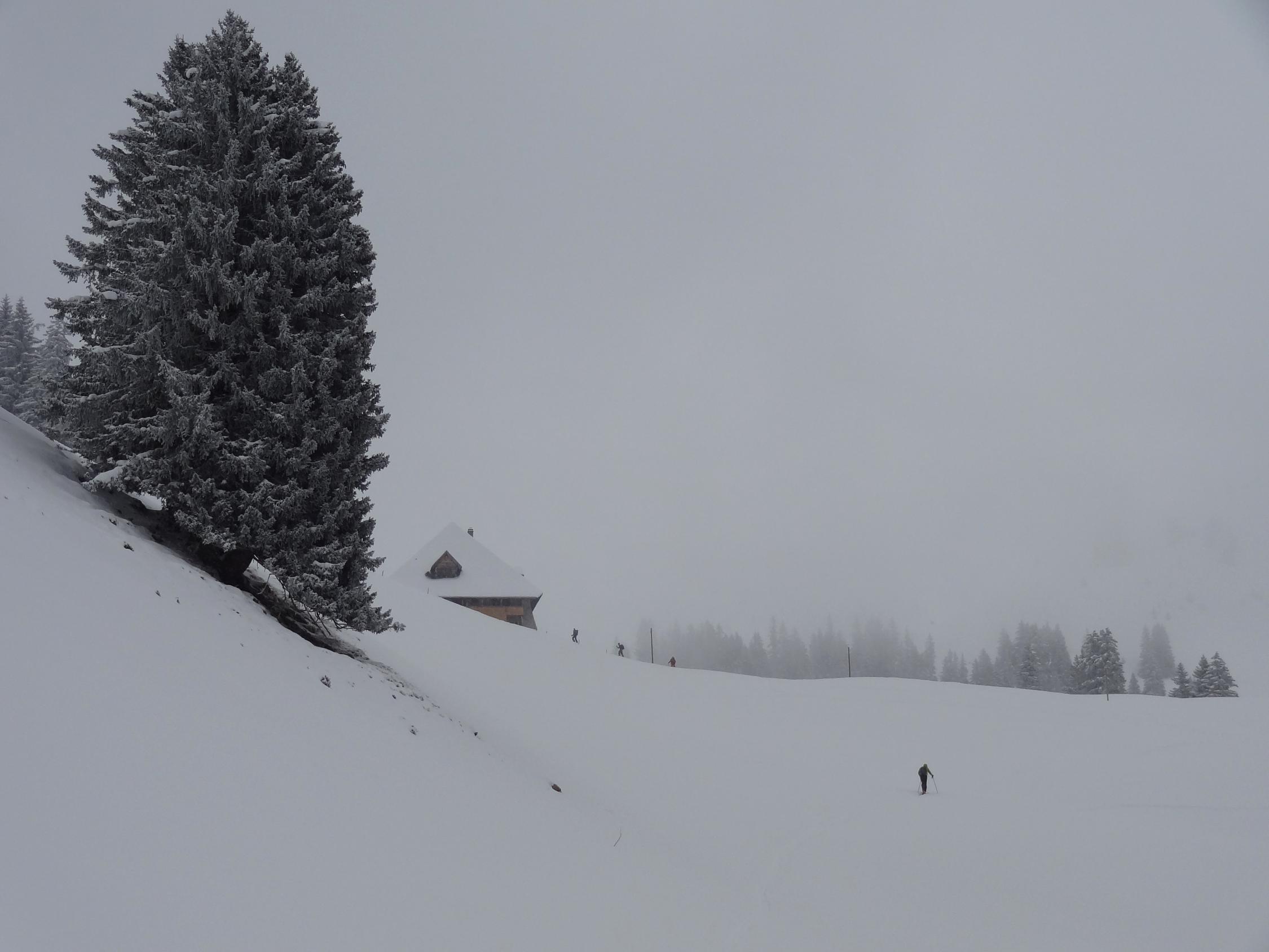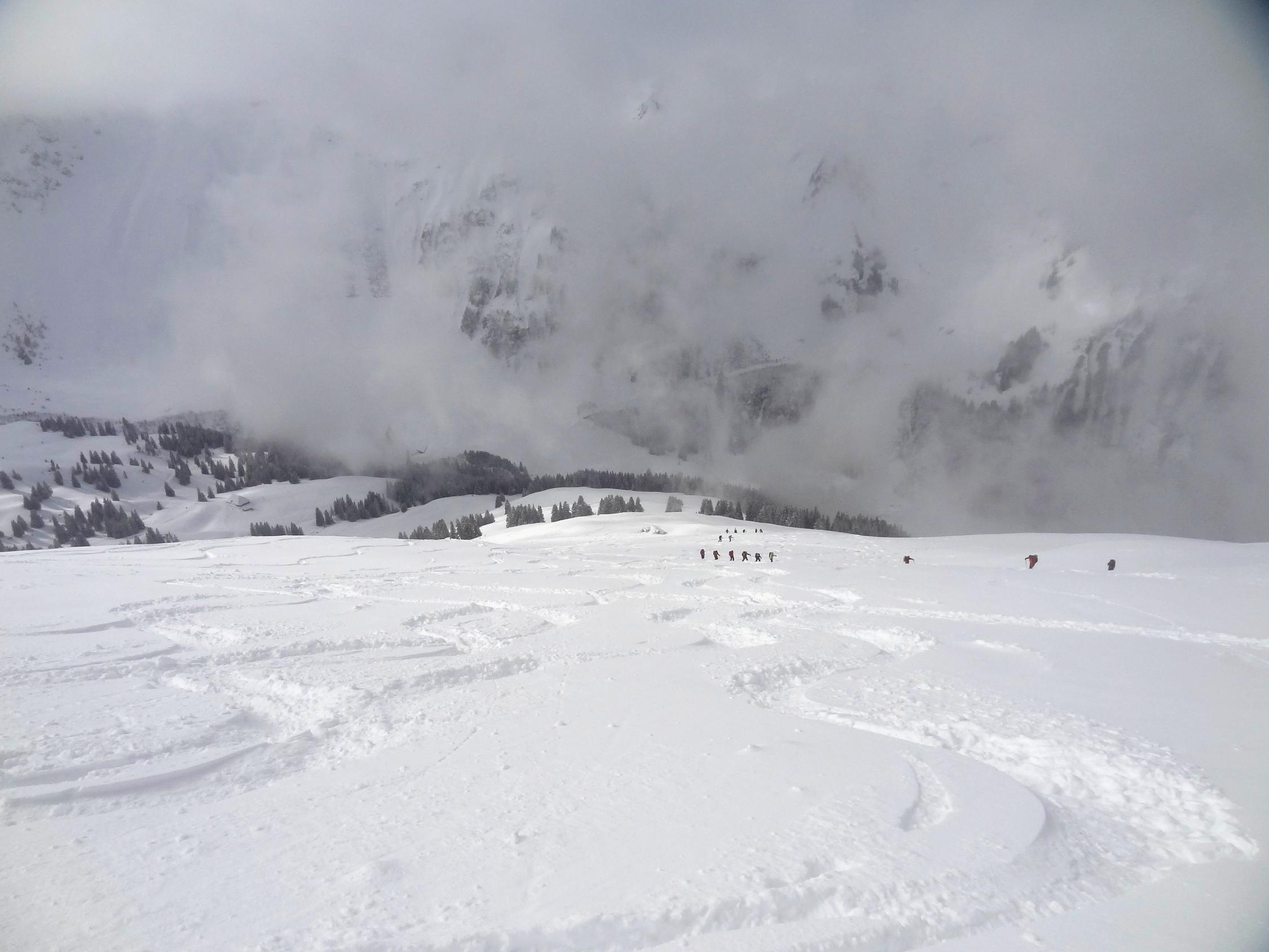 Der Neuschnee war durch die Wärme bereits am Morgen feucht. Erste 400 Hhm recht gut fahrbar. Bei der Abfahrt ab ca 1900 m unter den 10 cm Neuschnee ein schwacher Deckel der für schwierige Verhältnisse sorgte. Der Steibode wegen dem feuchter gewordenen Schnee ein wenig mühsam. Wäre das Wetter so gekommen gemäss Prognosen, wäre die ganze Sache halb so schlimm gewesen. Die erste 300 Hhm Abfahrt wurden im Blindflug genossen. Apropos Prognosen: Die Schweizer Meteorologen haben eine hohe Trefferquote, so sei ihnen dieses Faux-Pas für einmal verziehen.