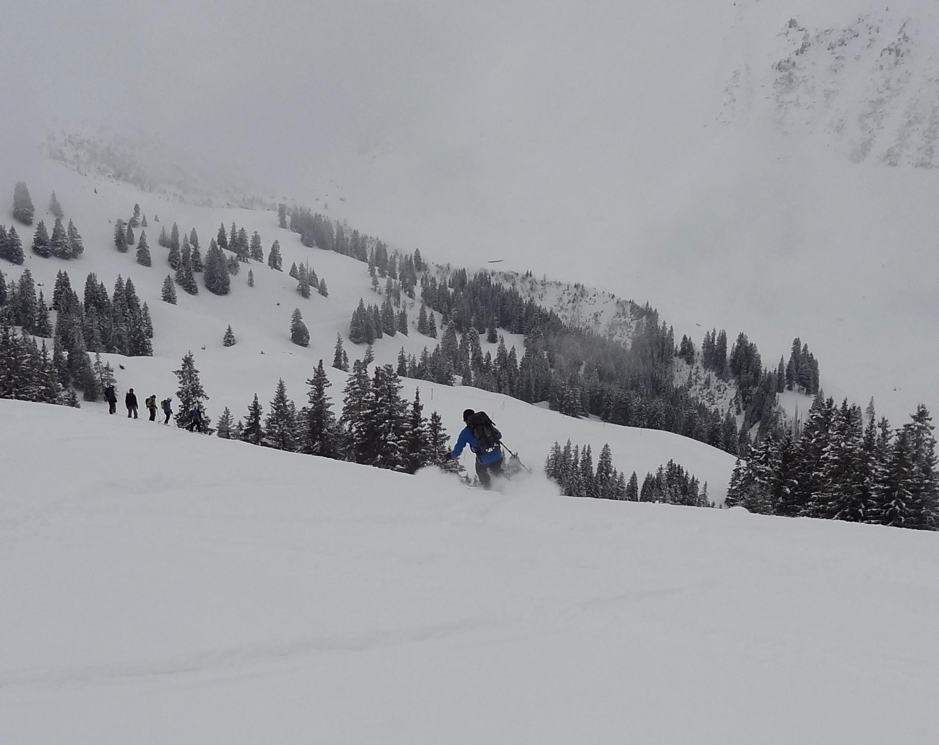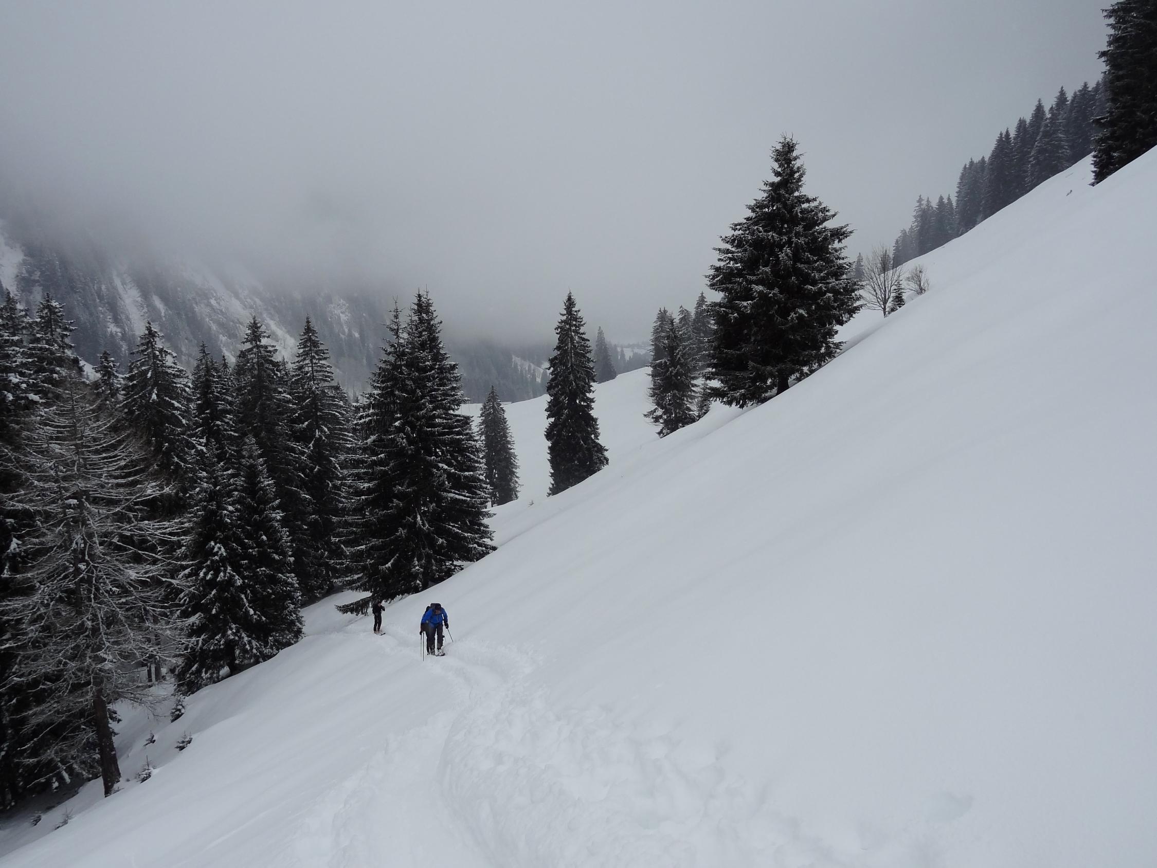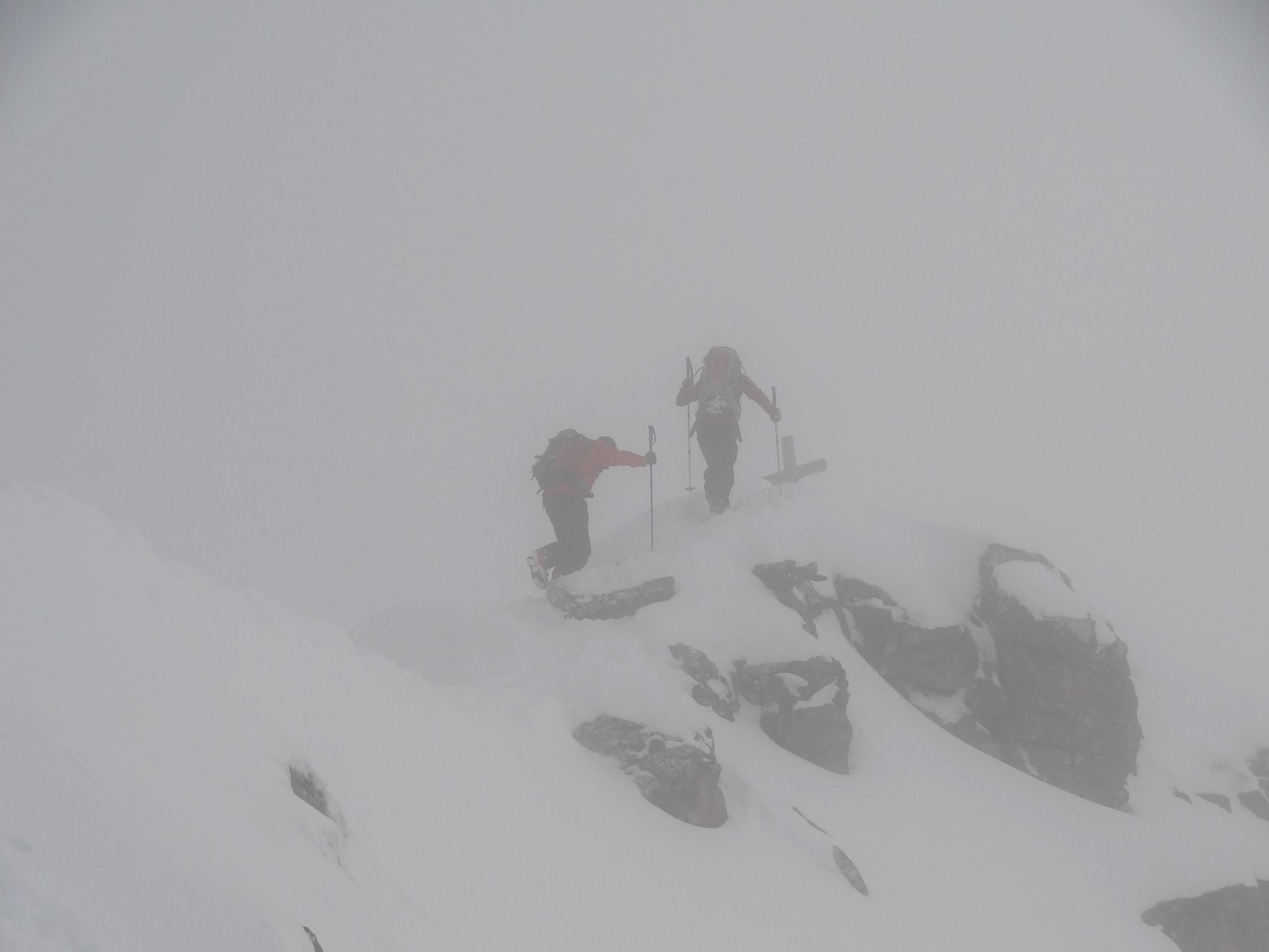 Der Neuschnee war durch die Wärme bereits am Morgen feucht. Erste 400 Hhm recht gut fahrbar. Bei der Abfahrt ab ca 1900 m unter den 10 cm Neuschnee ein schwacher Deckel der für schwierige Verhältnisse sorgte. Der Steibode wegen dem feuchter gewordenen Schnee ein wenig mühsam. Wäre das Wetter so gekommen gemäss Prognosen, wäre die ganze Sache halb so schlimm gewesen. Die erste 300 Hhm Abfahrt wurden im Blindflug genossen. Apropos Prognosen: Die Schweizer Meteorologen haben eine hohe Trefferquote, so sei ihnen dieses Faux-Pas für einmal verziehen.