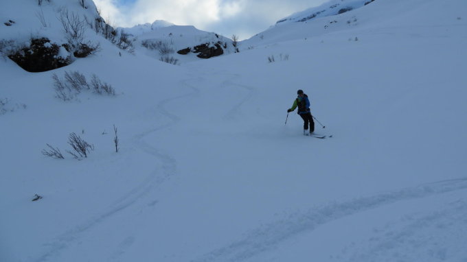 Aber je länger der Tag dauerte riss der Nebel löcher in den Himmel und die Abfahrt war super mit 20 cm herrlichem Pulverschnee.