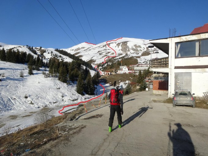 Unser erster Skitourentag in Mazedonien, perfekt organisiert von Skitourenkollege Ljupco. Routeninfos durch Bergsteigerklub in Tetovo, dessen Präsident uns die Routen aufs GPS lud. Vorzügliche Unterkunft mit kulinarischen Leckerbissen in der Snowpatrol Lodge in Popova Sapka. Skiort bekannt für Cat-Skiing, 2 Cats im Einsatz. Skilifte nicht in Betrieb. Entlang dem Winterweg lange anstrengende Skitour mit Auf und Abs, aber ohne grössere technische Schwierigkeiten oder Gefahren. Auf dem Titov Vrv bietet ein alter Turm Schutz vor der Witterung. Vielen Dank meinen Begleitern Ljupco und Dülle.