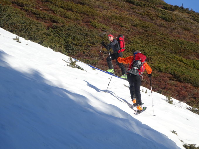 im Aufstieg gut tragende durchgehende Schneedecke, Grate manchmal abgeblasen, dort bieten Wechten Hilfestellung. Selten kratzten Steine an den Fellen. Abfahrt am Gipfelhang über schönsten Firn, Skitragestrecke entlang einem abgeblasenen sonnenexponierten Südosthang, dann wieder schöne Abfahrt auf wechselnd pulvrigem, windgepresstem oder hart verfirntem Schnee ins Skigebiet von Popova Sapka.