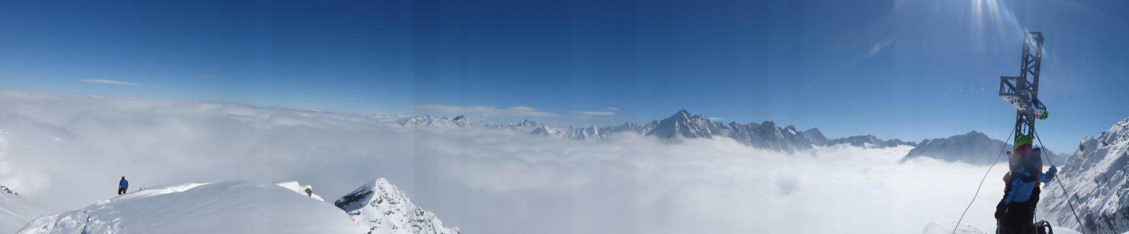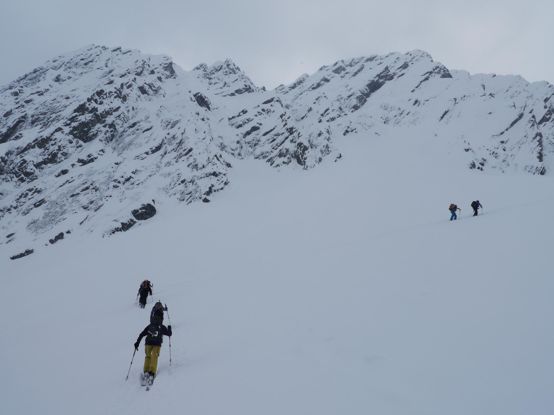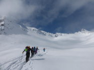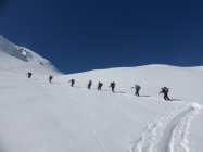 Bei P 2720 Teil der Gruppe zurück geblieben, Rest zum Skidepot 100m unterhalb des Gipfels und zu Fuss auf den Gipfel.