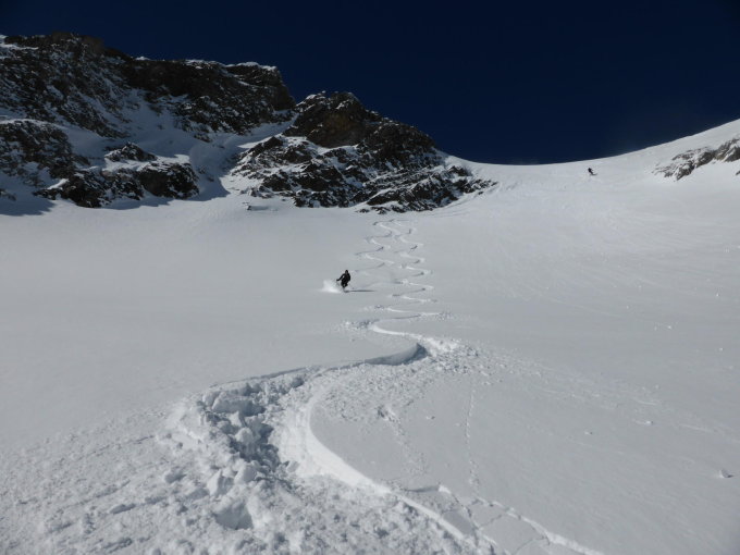 Hartschnee, Bruchharst, Windharst im Aufstieg. Teilweise sehr wenig Schnee im Aufstieg. Ab dem Clariden Pulver bis Jägerbalm. Zum Tüfelsjoch beim Einstieg "Felsriegel" etwas anspruchsvoll, dann Bügeltritte und eine Kette.