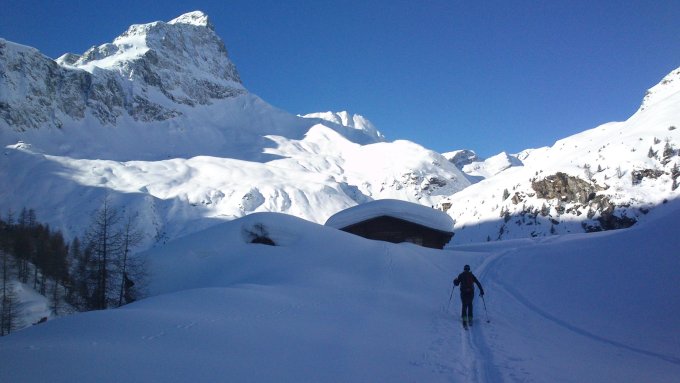 Die Mitnahme der Schi das steile SW-Couloir hinauf ist ratsam, sobald man dieses verlassen hat tiefer, weicher Schnee.