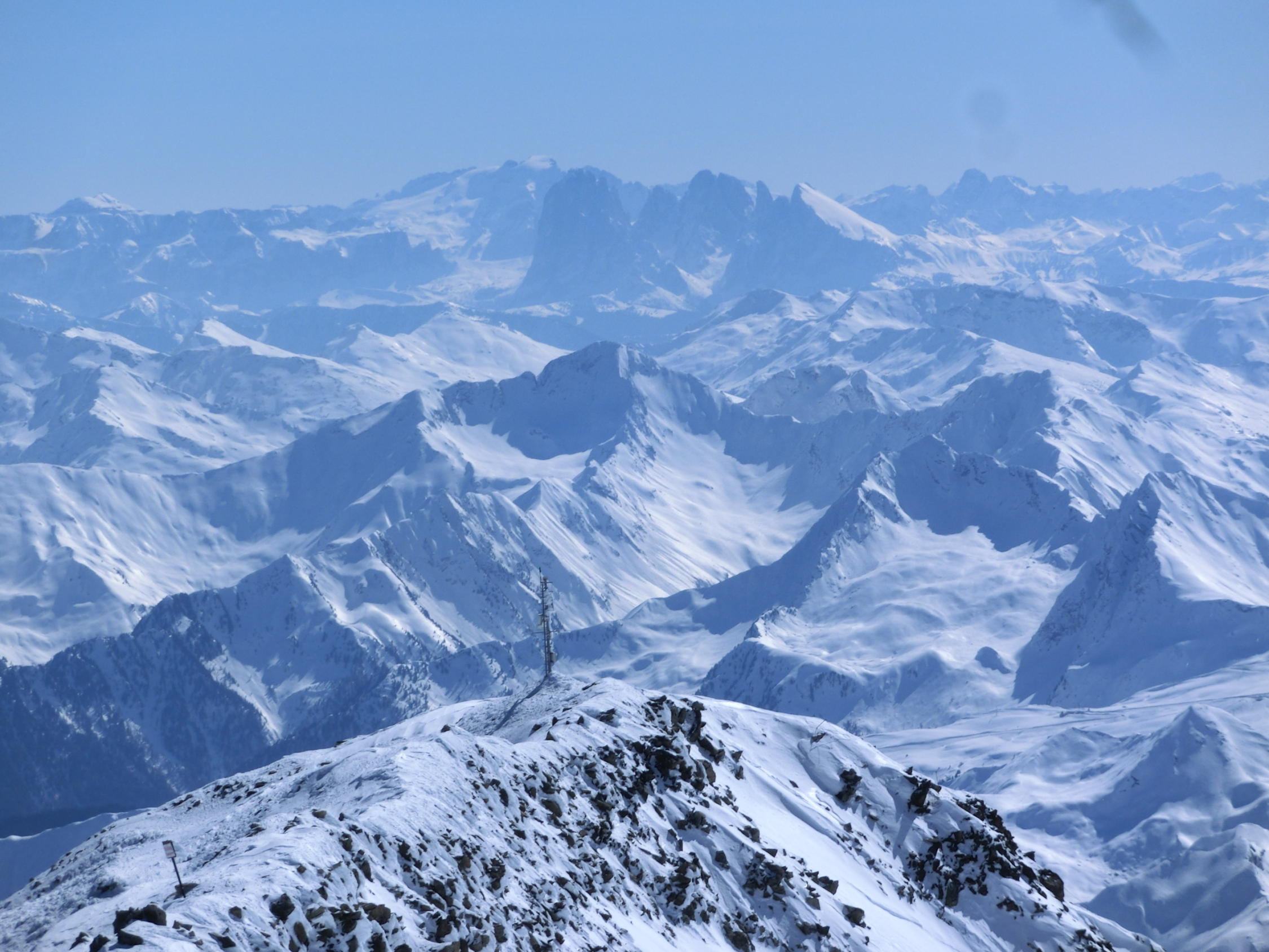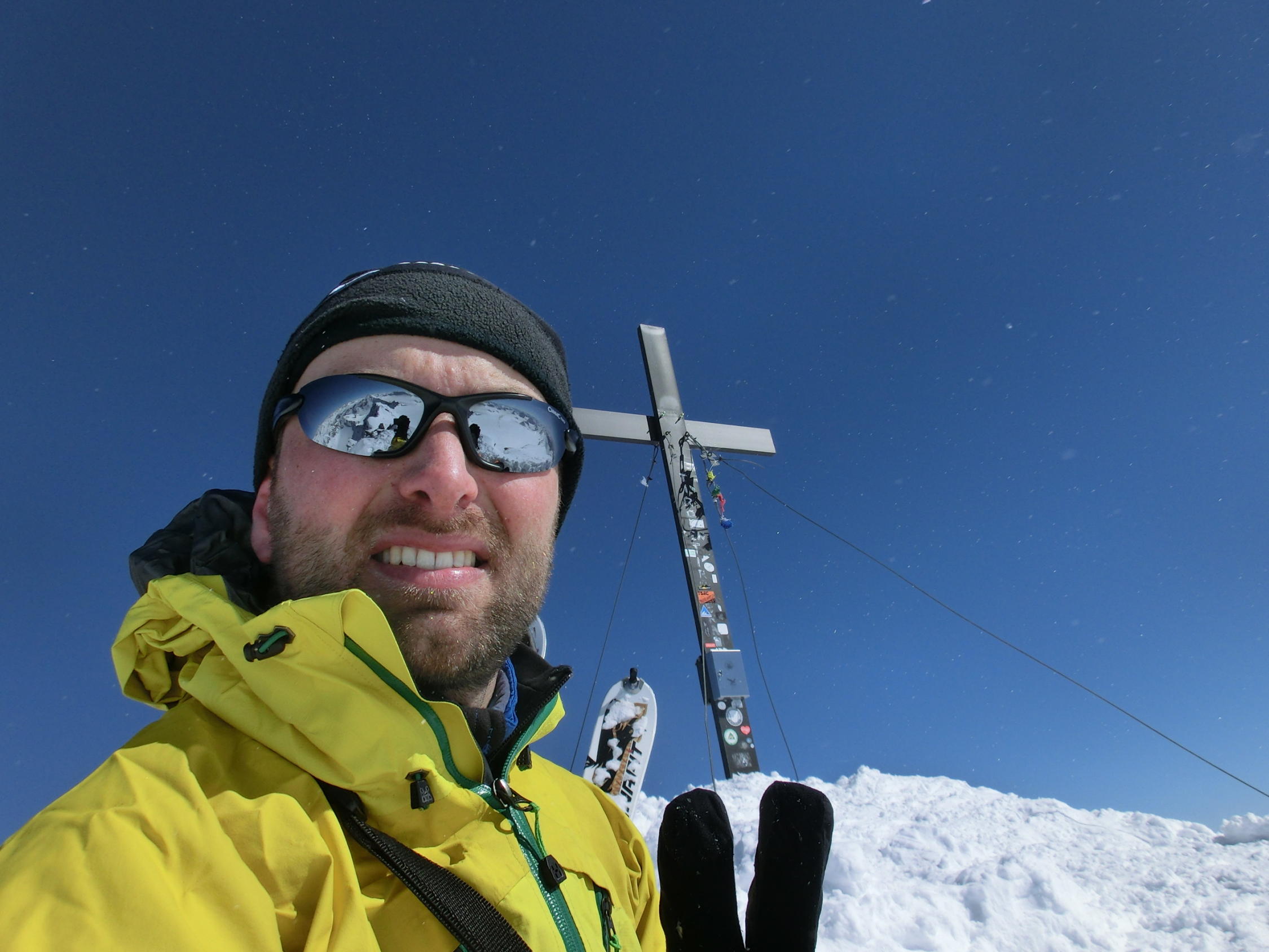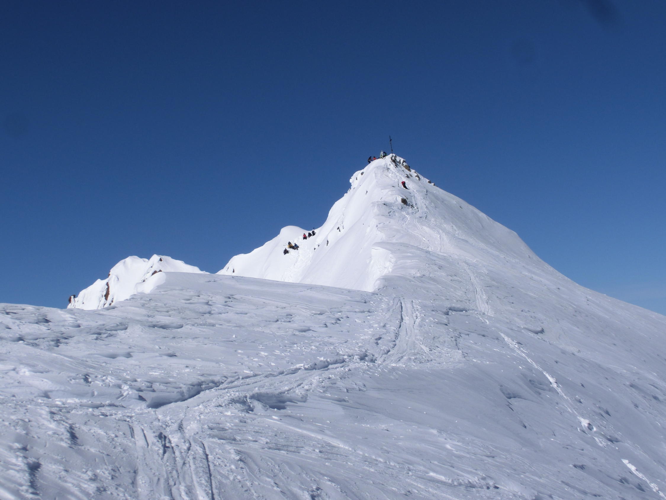 in 3.5h zum Gipfel, hab die bestehende Spur vom Vortag oft neu gespurt, da sie vom Wind zugeweht wurde; Harscheisen oder Steigeisen werden (noch) nicht benötigt;