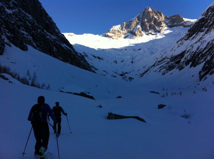 Die Verhältnisse sind gut, können aber noch besser werden. Ganz oben Pulver sehr gut. Ab 2900m schwerer Pulver mit leichtem Deckel, weiter unten wird der Schnee schwer und ganz unten ist die Schneedecke durchnässt.Aber auf der ganzen Route ist der Schnee gut fahrbar. Die Ski müssen etwa eine halbe Stunde getragen werden.
