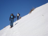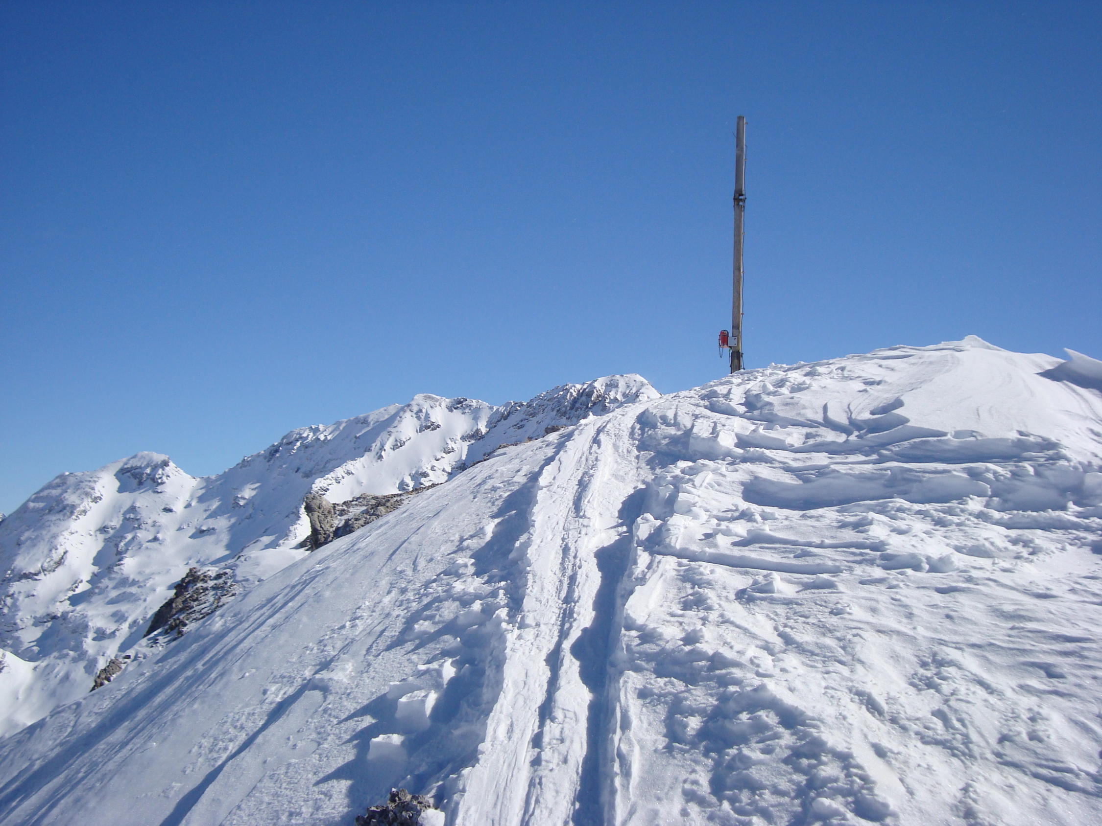 Pickel mitgeführt, aber nicht gebraucht. Harscheisen am Gipfelaufbau montiert.