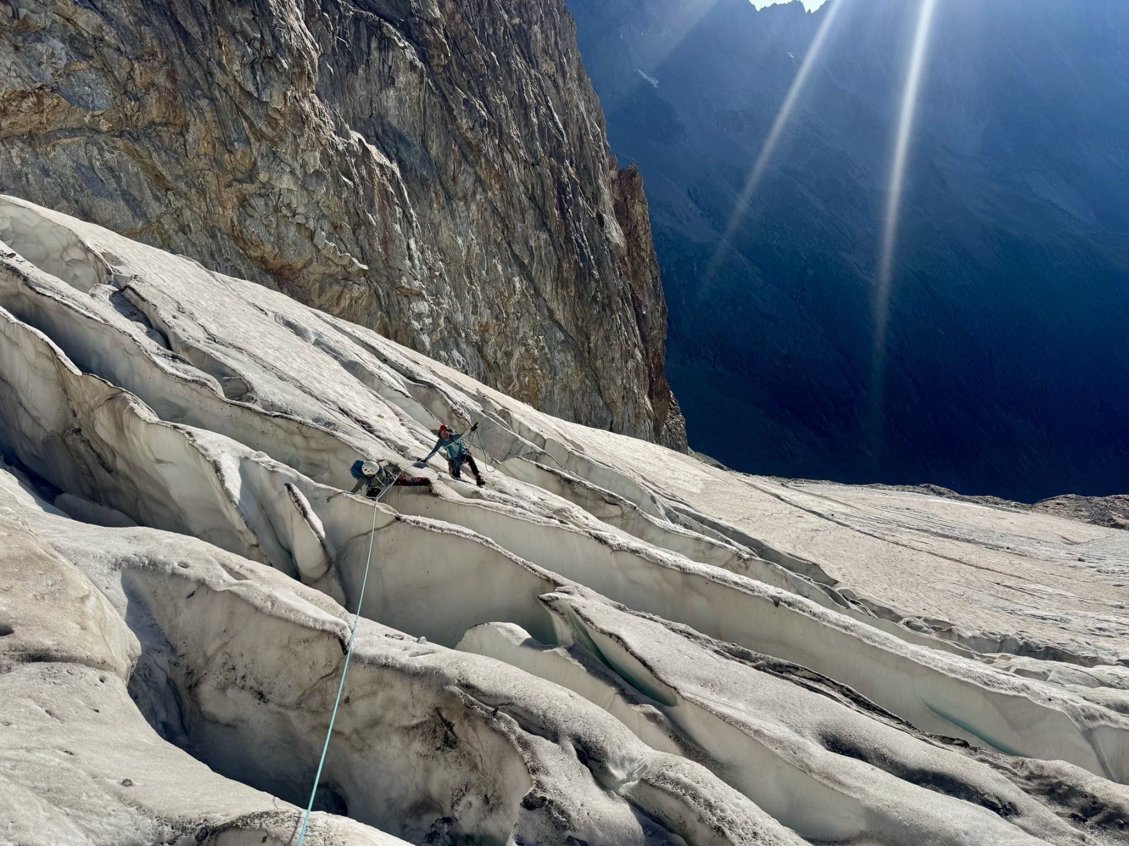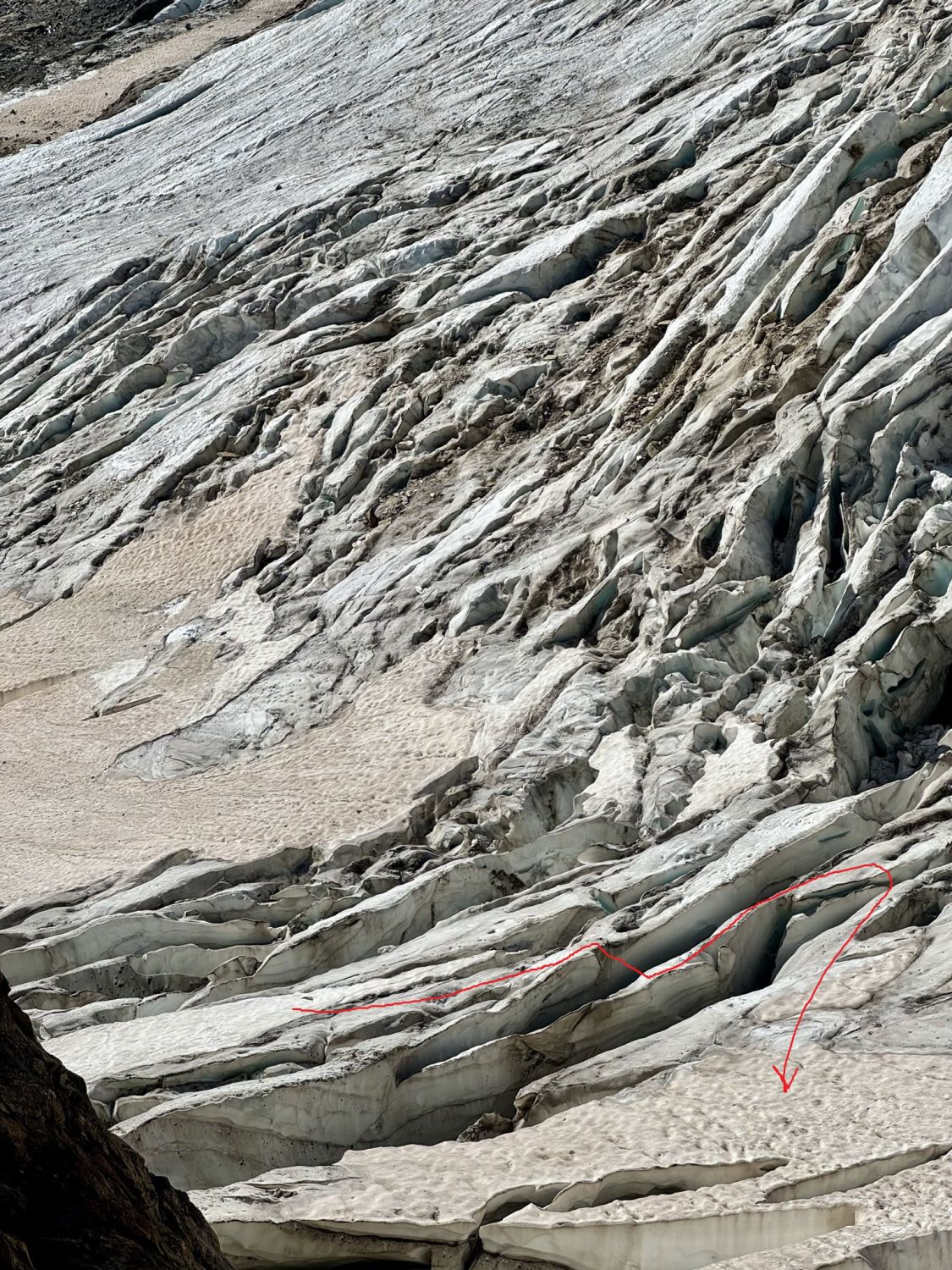 Der Gletscher hat schon etwas Probleme bereitet, da die Spalten ein paar 100m unter dem Einstieg schon komplett Schneefrei sind und nur mit einem sehr grossen Ausfallschritt über eine ausladende Spalte passierbar waren. Es braucht lange Beine, gute Balance und eine grosse Portion Mut. Eisschrauben sind auch empfehlenswert. Der Bergschrund bzw. die oberste Spalte hingegen (ganz unten auf dem ersten Bild) hat noch eine dicke Schneebrücke und ist gut passierbar.