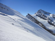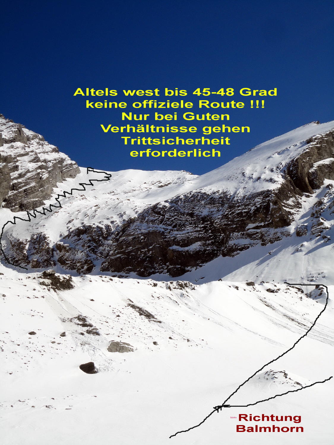 Altels Westcouli Von der Bahnstation Normalroute wie Balmhorn Zaggengrat bei Punkt 2500 Anfangs Schwarzgletscher links auf die Mörene hochsteigen. Markantes Couli ersichtlich breit und steil, aber geil.