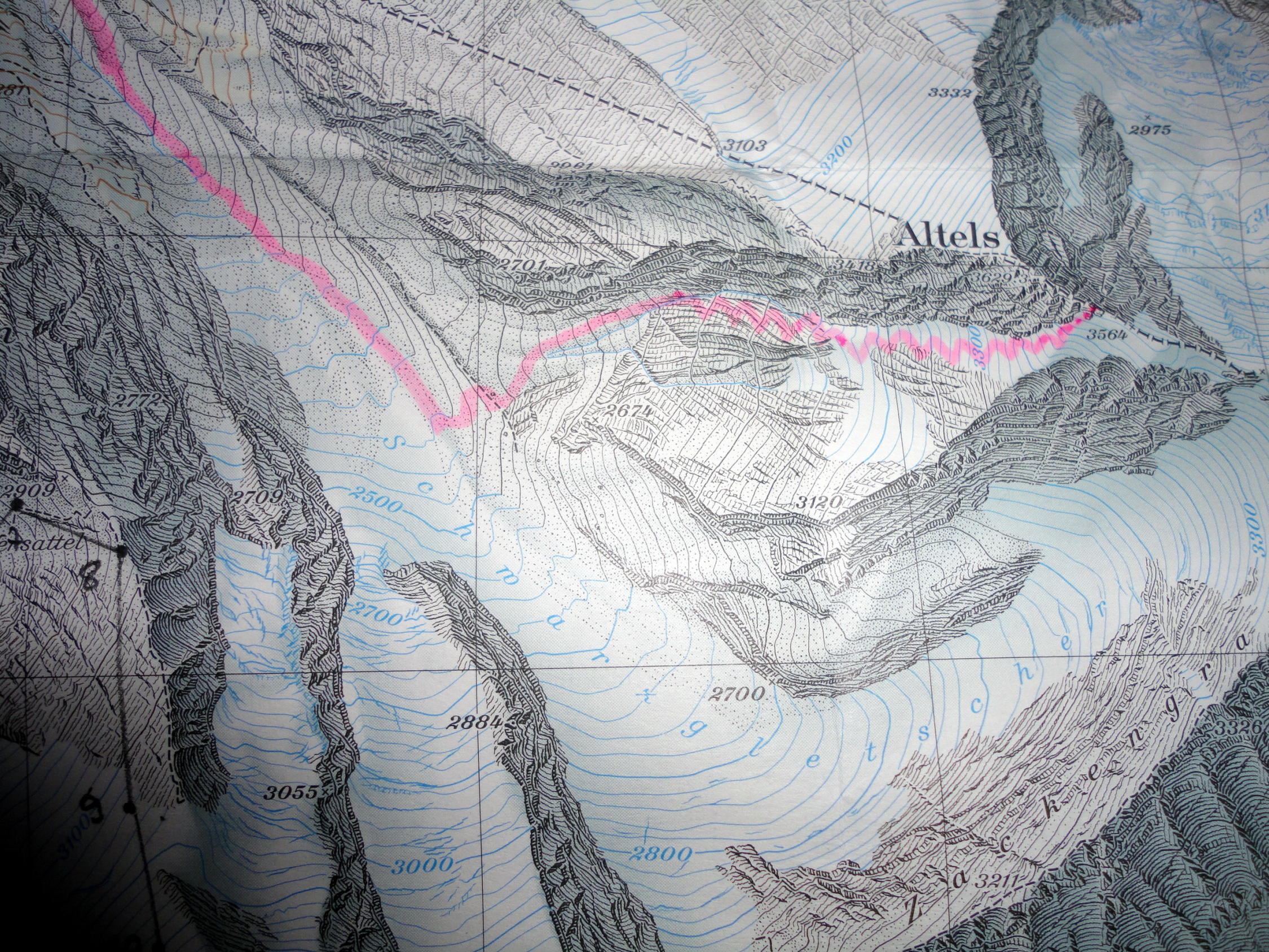 Nach dem Couli Punkt 3100 breite Schulter links hochsteigen bis Gipfel des Altels.