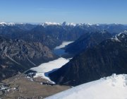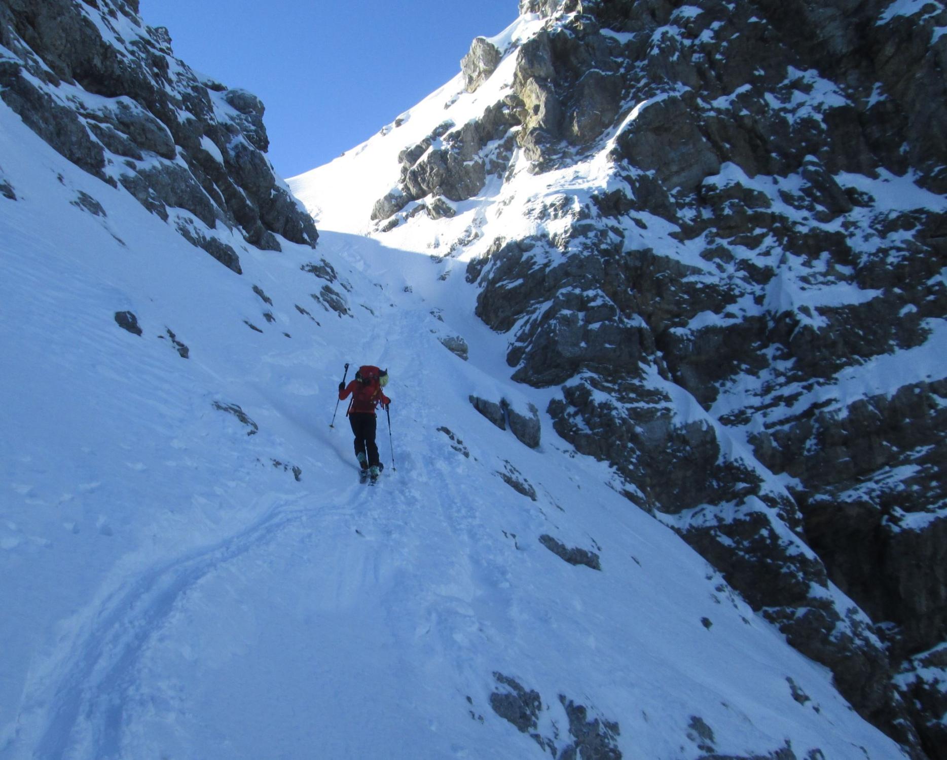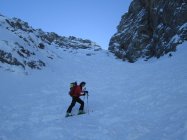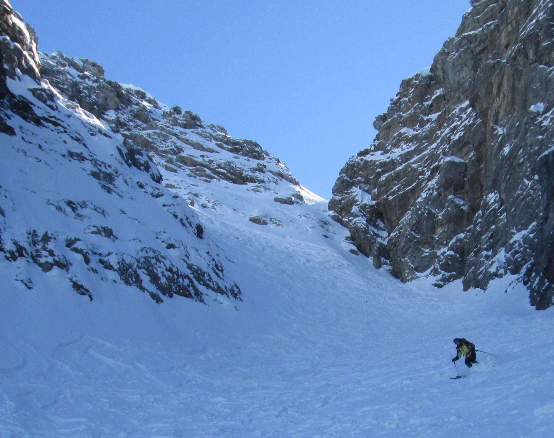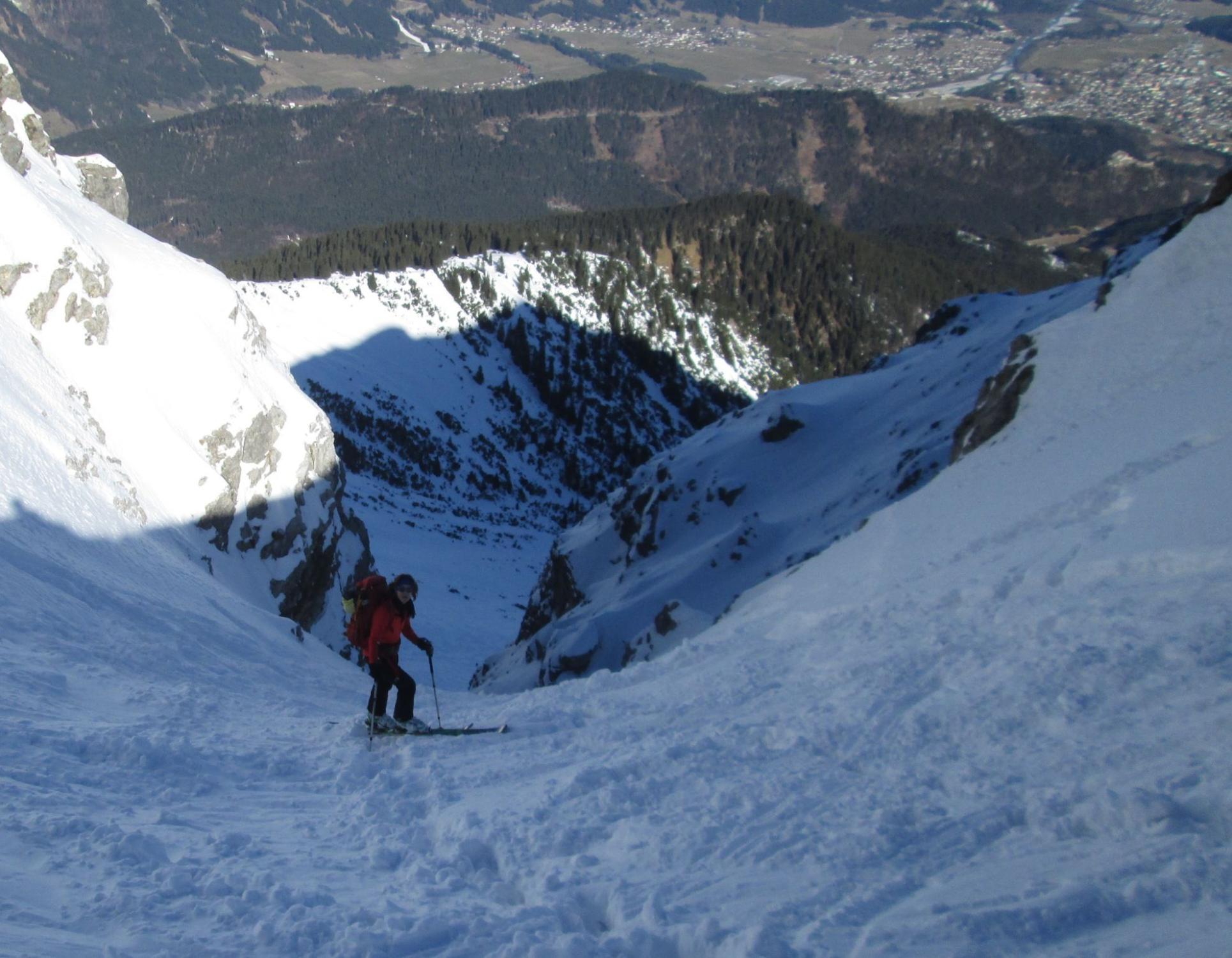 Bei der Abfahrt (ca. 11.30 h) oben Firn, aus dem mittlerweile schon einige Steine rausschauen, die ersten 100 hm unterhalb der Scharte tiefer, zerpflügter Schnee, danach schöner Pulver. Trotz einiger Begehungen die letzten Tage immer noch Platz für eigene Spuren. Nordrinne wurde auch befahren. Temperaturen trotz des langen Schattenaufstiegs sehr mild und oben fast windstill.