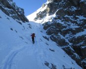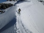Nordseitig trotz des niedrigen Ausgangspunkts gute Schneelage. Auch oberhalb der Piste im Tobel bzw. Wald ausreichend Schnee für Aufstieg und Abfahrt. Der Felsdurchstieg ist ebenfalls gut eingeschneit und war zumindest im Aufstieg sogar mit Ski machbar. Auf der Südseite gerade noch ausreichend Schnee für die letzten 200 hm Gipfelanstieg. Morgens hier noch recht hart und mit Harscheisen angenehmer.