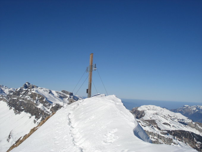 Start am 7.00 Uhr. Beim Schwarzenbach, dann entlang der Galtenebnetstrasse Pisten ähnlich. Wir haben die Strasse nach Waldhüttli gewählt, da flächerer Aufstieg, ab Waldhüttli nach Alp Gigen gut grifige Spur, heute bei Schlüsselstelle Ende Wald mit Ski gut zu machen, ab Gigen sehr schöne Spur vorhanden, bis Träsmeren. Gipfelhang wenig Schnee vorhanden aber mit Harscheisen bis Gipfellücke beim Skidepot auch OK, Fussaufstieg entlang dem Grat sind schöne Trittspuren vorhanden. Der Gipfelgrat ist sehr ausgesetz.