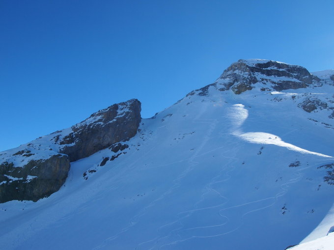 Route durchwegs gut eingeschneit. Spur hoch bis unter die Felsen der Vorderi Bütlasse sowie im Gipfelhang Harscheisen empfehlenswert. Couloir guter Trittschnee.