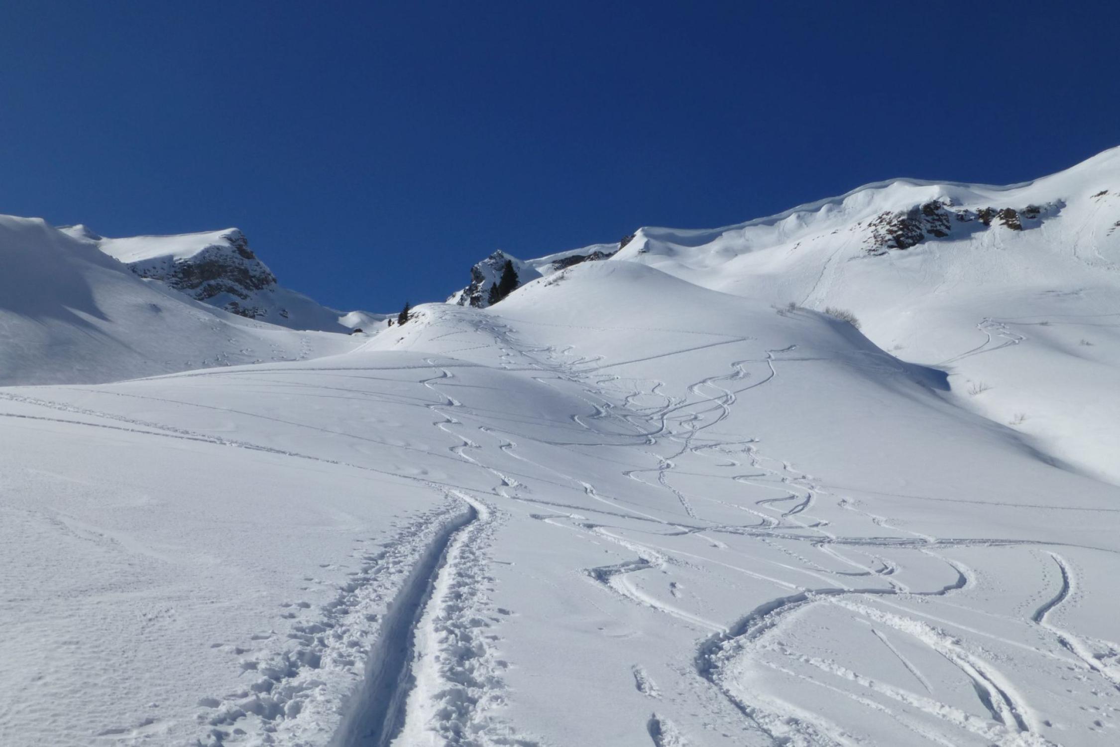 In den NO-Hängen noch überwiegend herrlicher Pulverschnee - trotz vieler Abfahrtsspuren noch genügend Platz für eigene Spuren im unverspurten Gelände.