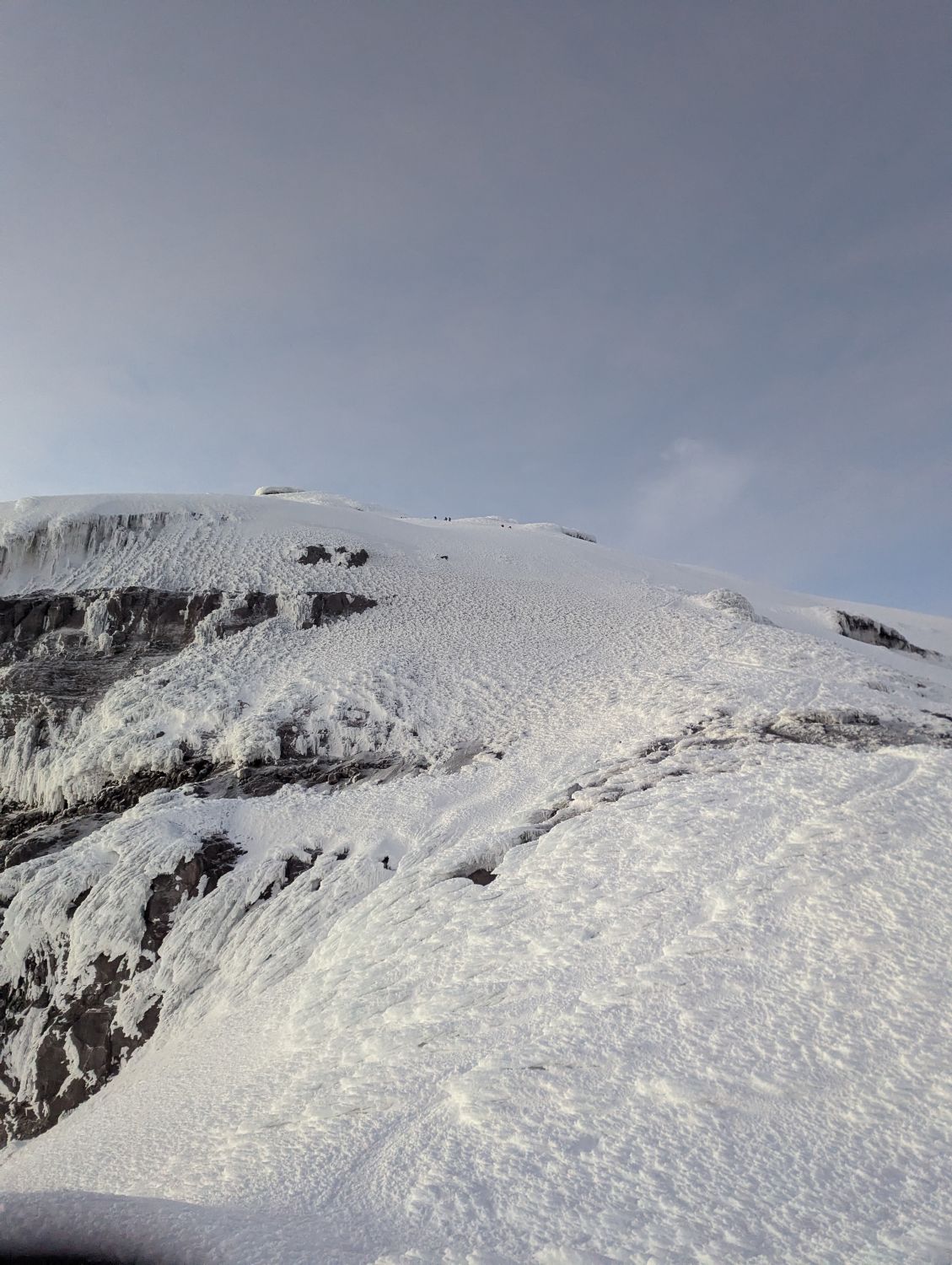 Abklingender Sturm der letzten Tage noch mit Wind bis 50 km/h zu spüren, aus -13 werden so gefühlte -20 °C. Schnee/Eis 1a