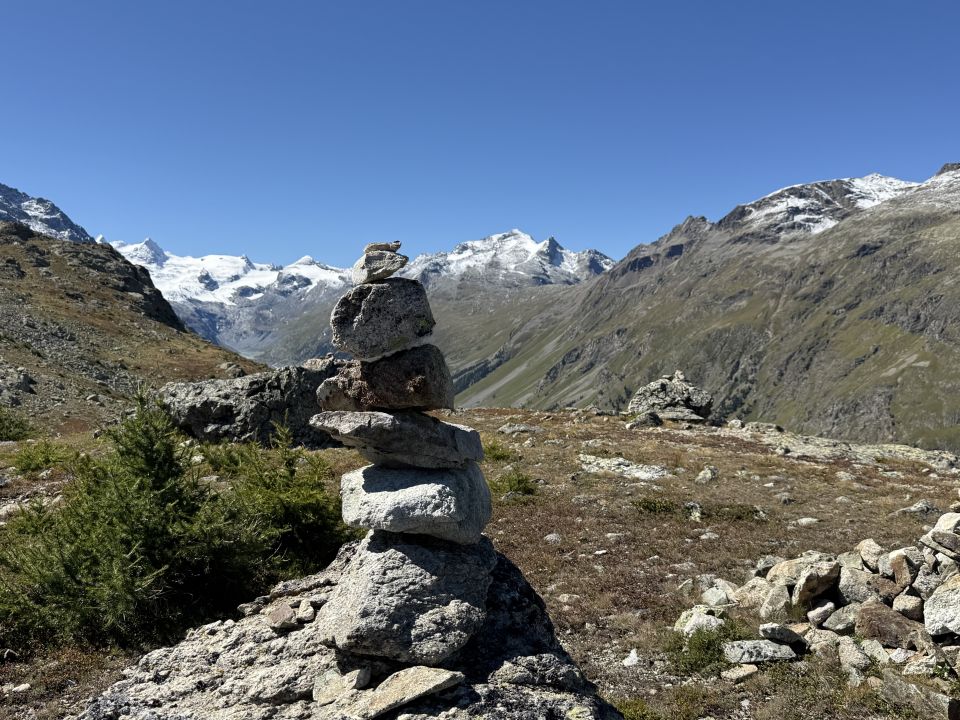 Wandertour auf den Gratausläufer Piz Chalchagn 3154 mit toller Rundsicht, T3, ÖV Tour. Start Bahnhof Pontresina, 8 Uhr, 3 Grad, windstill, perfektes Wetter mit schöner Fernsicht. Den schönen Wanderweg hoch im Wald, in der Flanke steil, aber gute Treppen mit Steinen versehen. Sonne ab Punkt 2254. Jetzt nicht markiertem Weg folgen in der Flanke Muot d‘Mez bis Punkt 2500. Zahlreiche schöne Arven. Abstieg via Laviner und auf Forststrasse Tais Giuven bis Surovas.