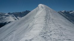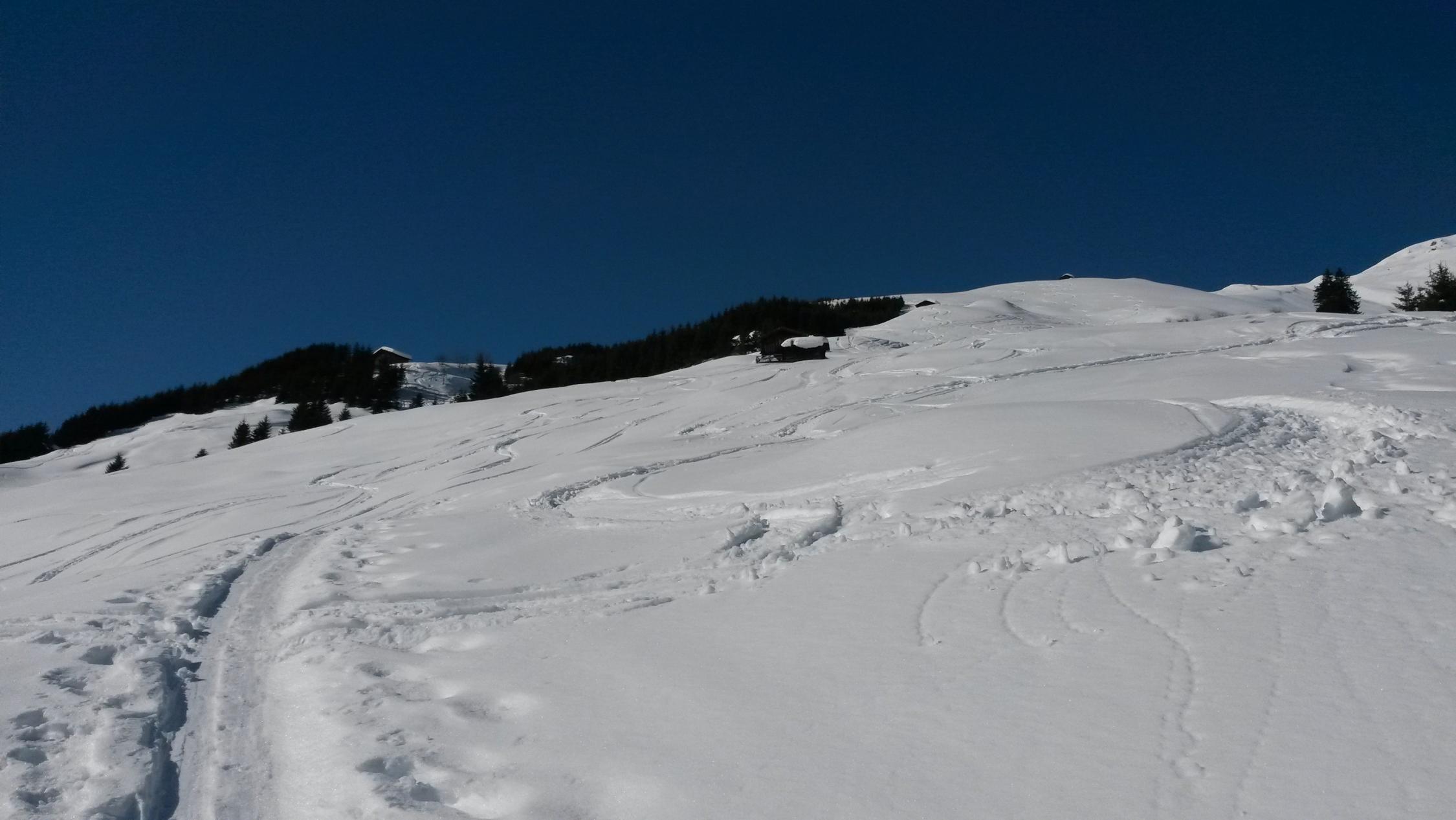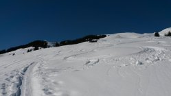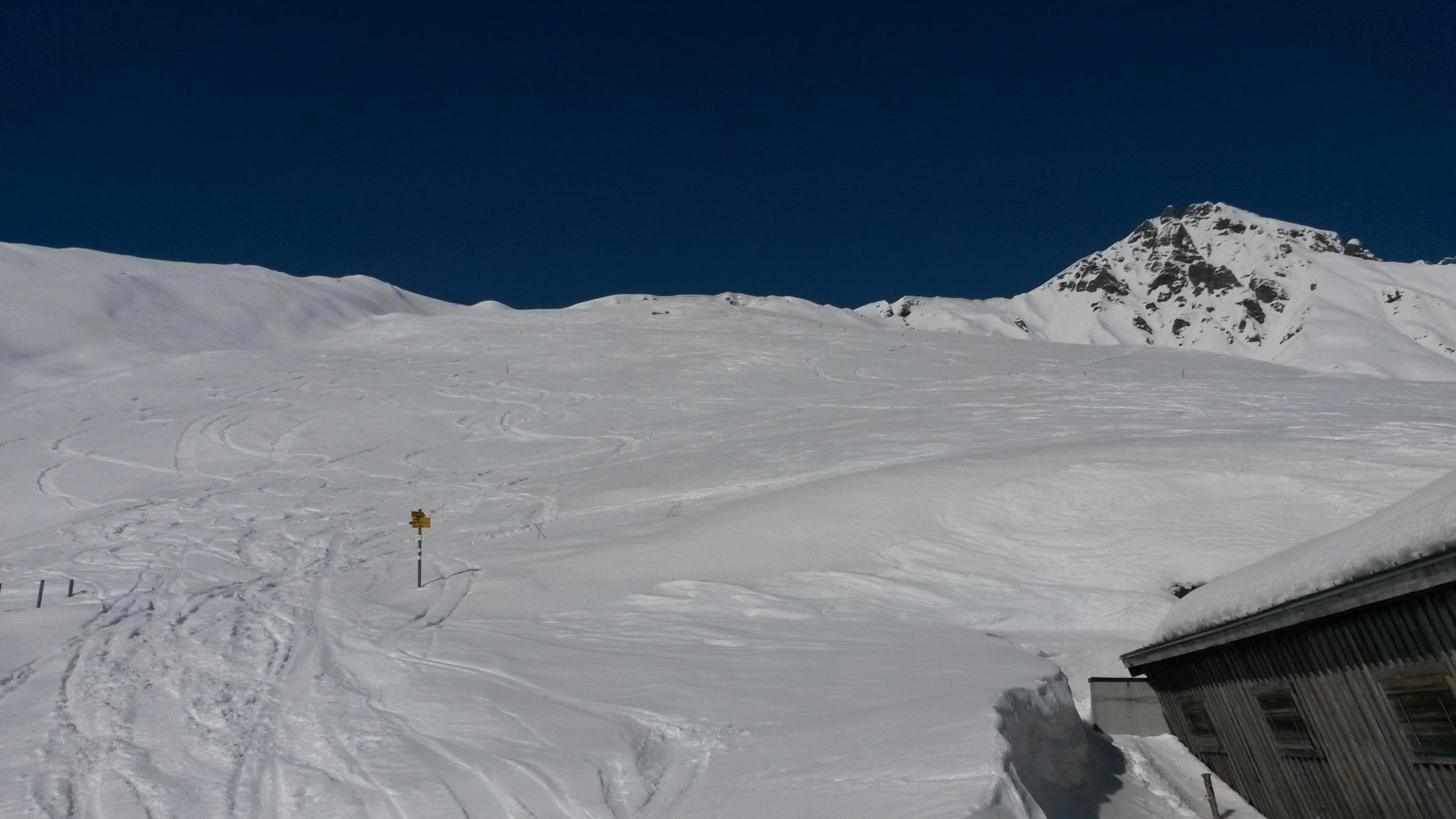 Aufgrund des warmen Wetters sollte die Tour möglichst am frühen Nachmittag beendet werden. Am Morgen hatte es eine tragfähige Schneekruste, jedoch bereits am Vormittag war der Schnee feucht und schwer.